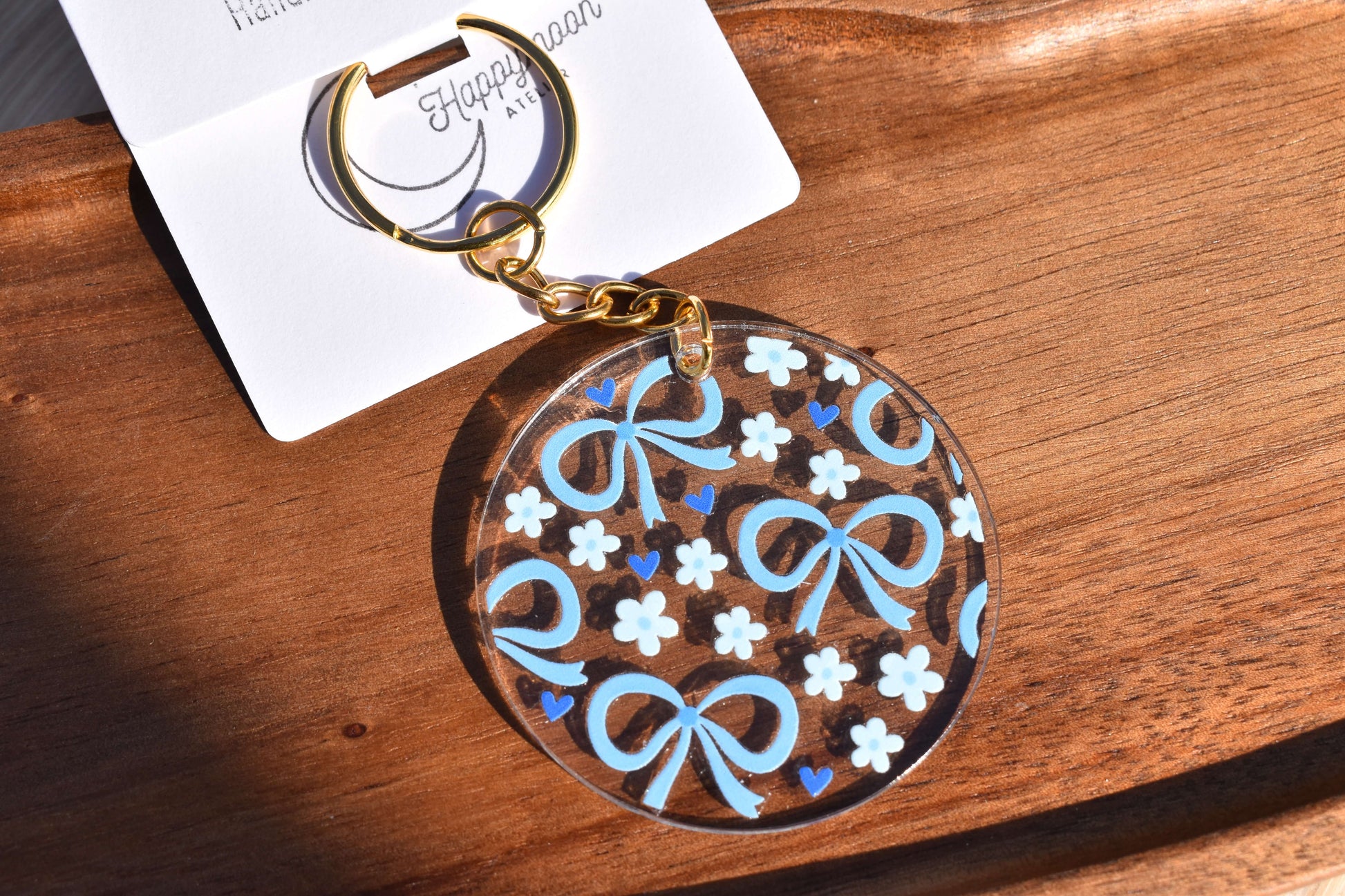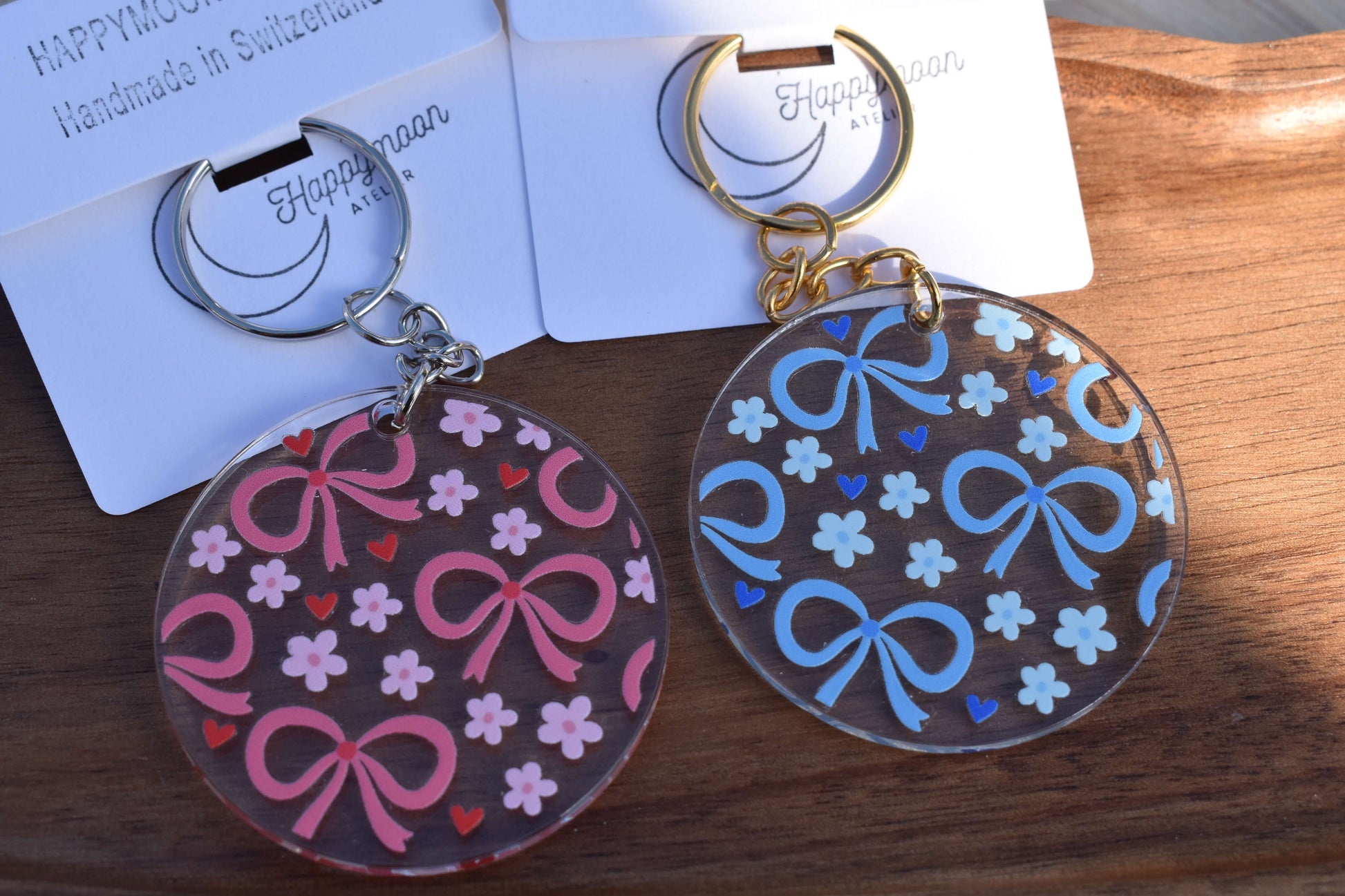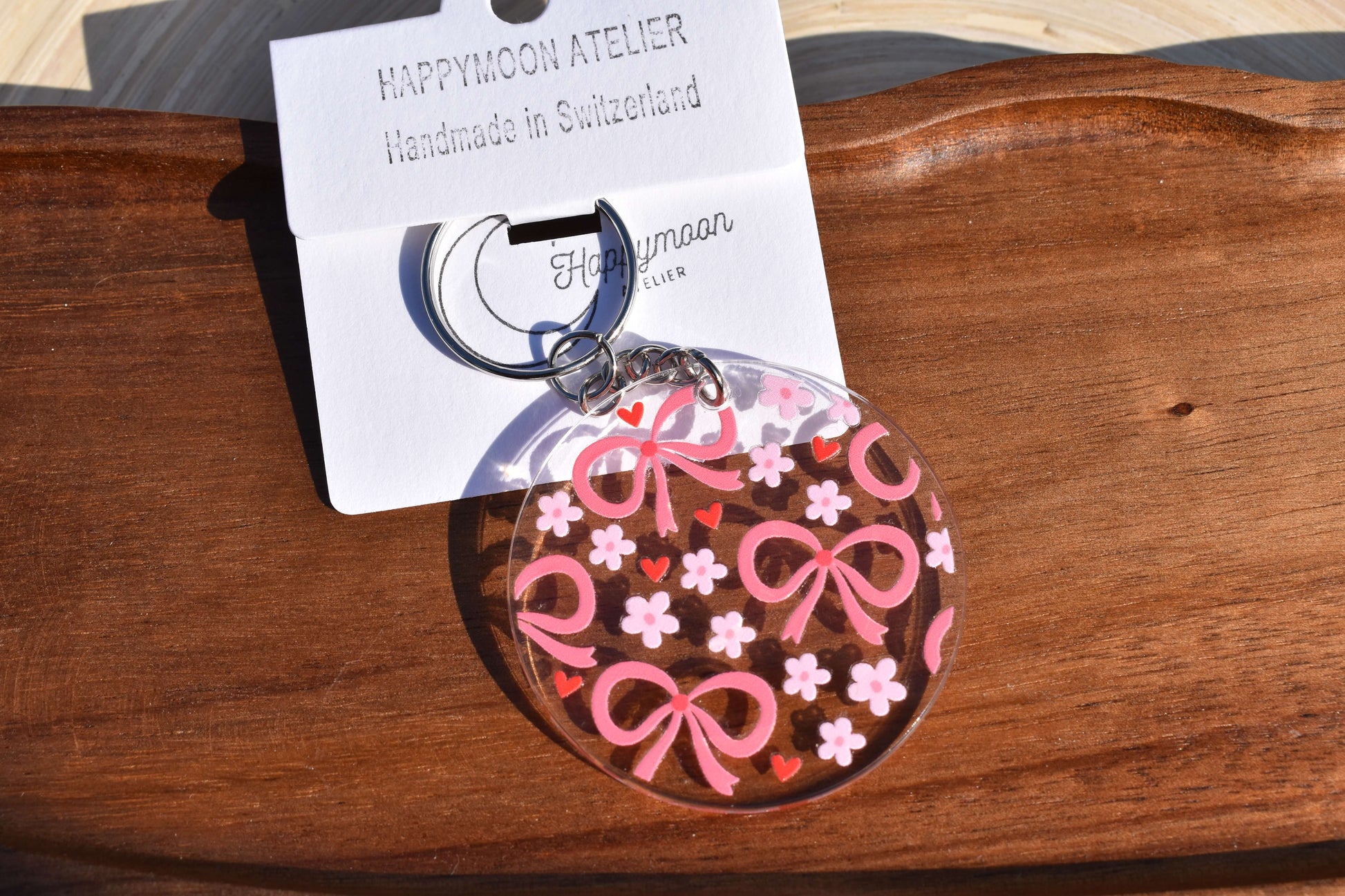 Zart, verspielt und einfach zum Verlieben - dieser Acryl-Schlüsselanhänger ist das perfekte Accessoire für alle, die feminine Designs lieben. Das hübsche Schleifenmuster, kombiniert mit kleinen Blüten und Herzchen, verleiht deinem Schlüsselbund, deiner Handtasche oder deinem Rucksack einen Hauch von Eleganz und Charme. Durch das doppelseitige Design sieht er von jeder Seite einfach grossartig aus.