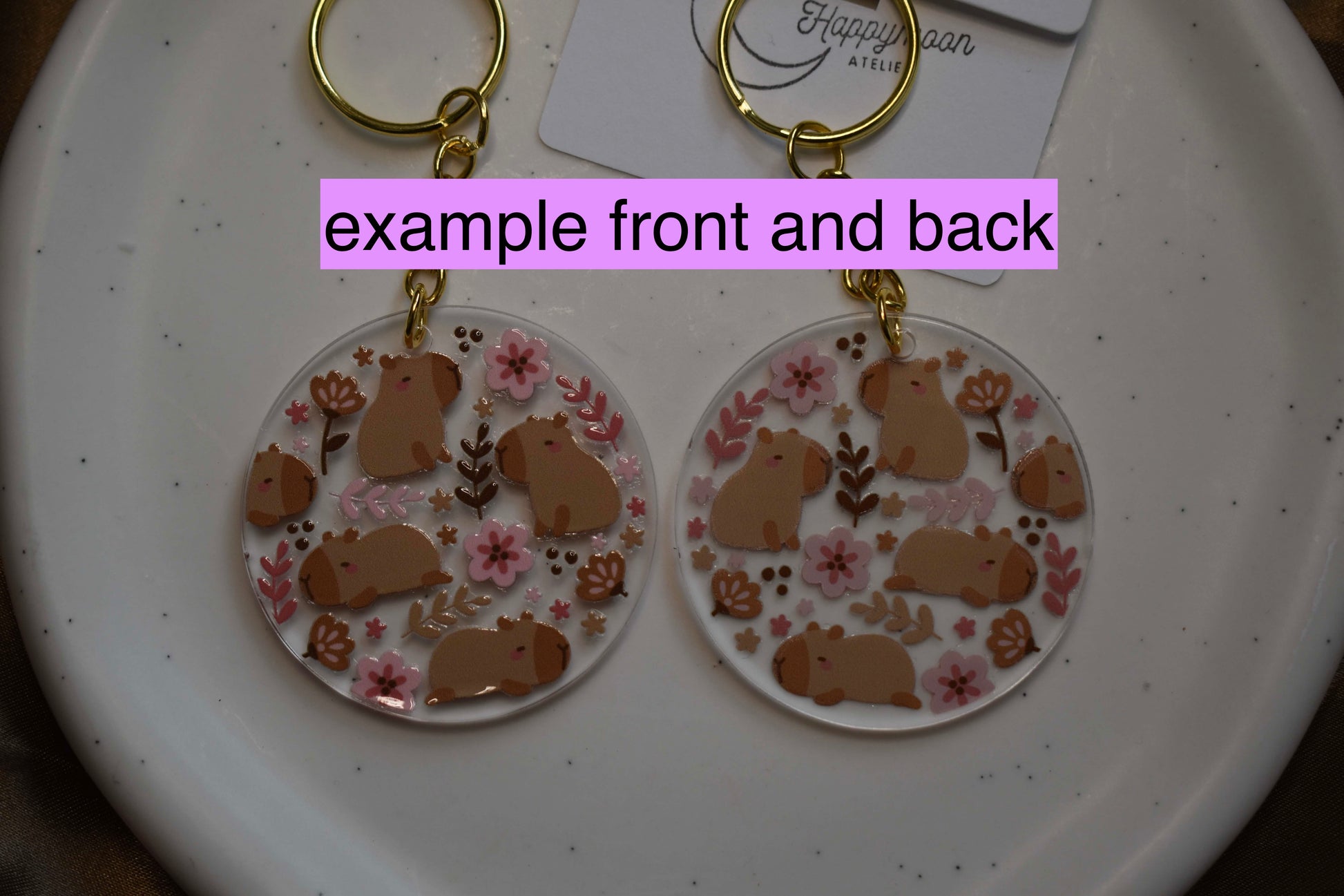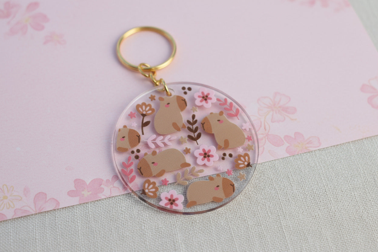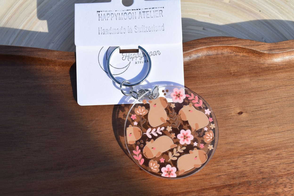 Ruhig, süss und einfach zum Verlieben - dieser Acryl-Schlüsselanhänger bringt die entspannte Stimmung der kleinen Wasserschweine direkt in deinen Alltag. Das liebevolle Design zeigt niedliche Capybaras zwischen zarten Blumen und Blättern - perfekt für alle Tierfreunde, die besondere Motive lieben.