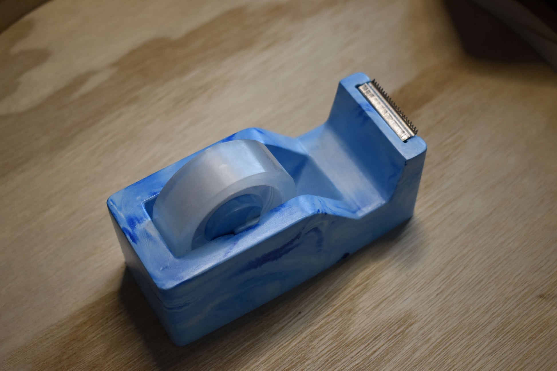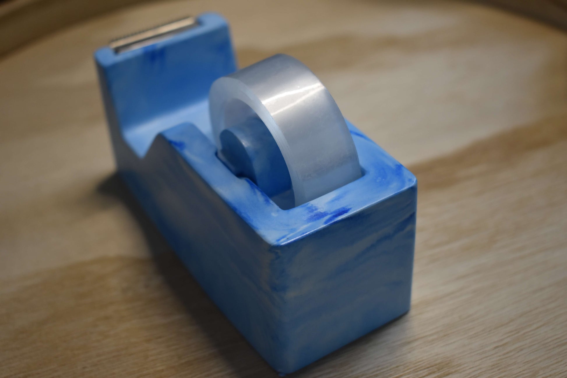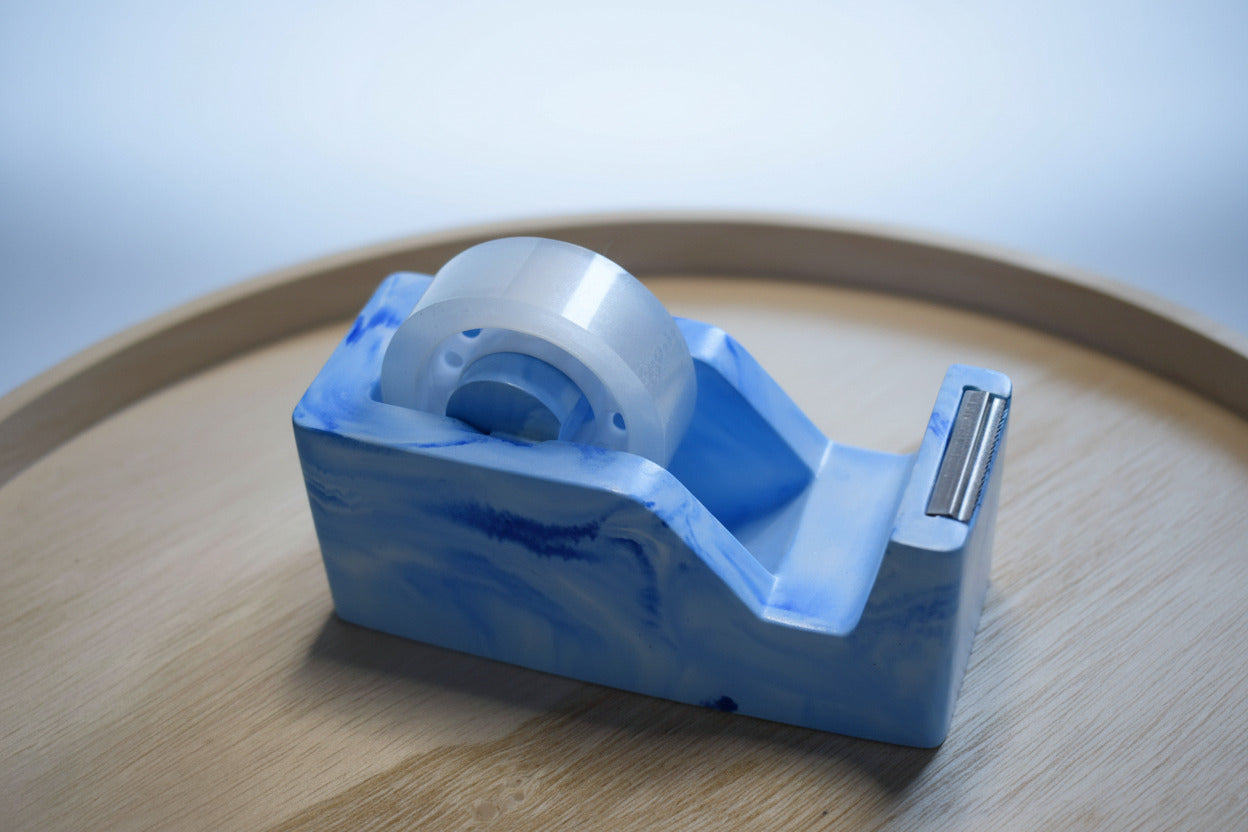 Der Blue Current Klebebandabroller ist mehr als nur praktisch - er ist ein Statement-Piece für deinen Arbeitsplatz. Jeder Abroller wird von Hand aus hochwertigem Raysin gegossen, geschliffen und mit einem hochwertigen Lack versiegelt, um ihm eine glatte, leicht glänzende Oberfläche zu verleihen.