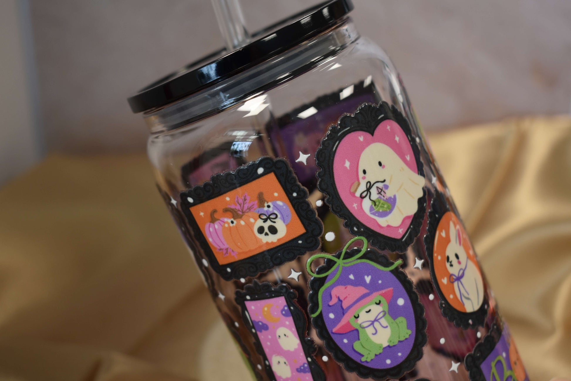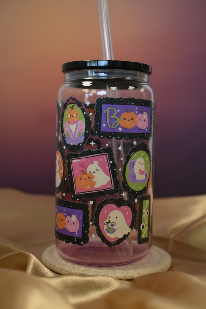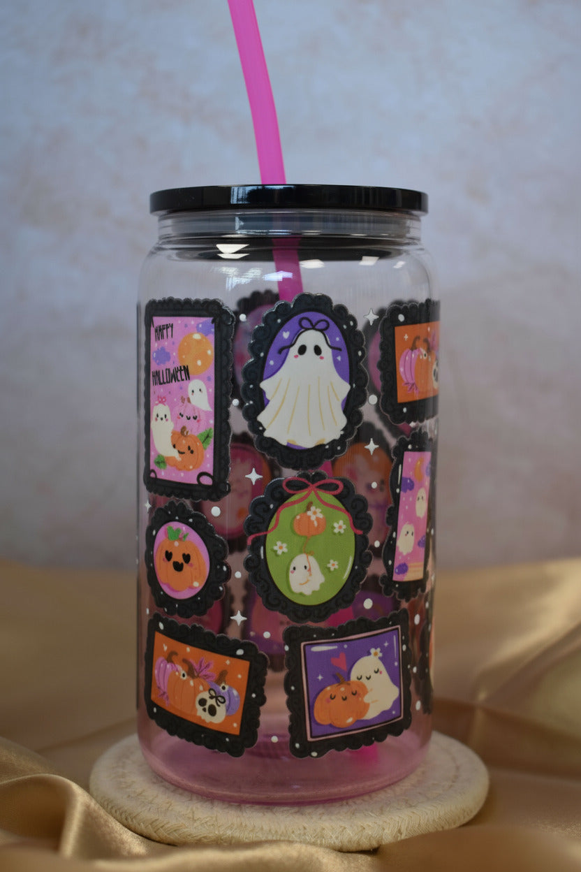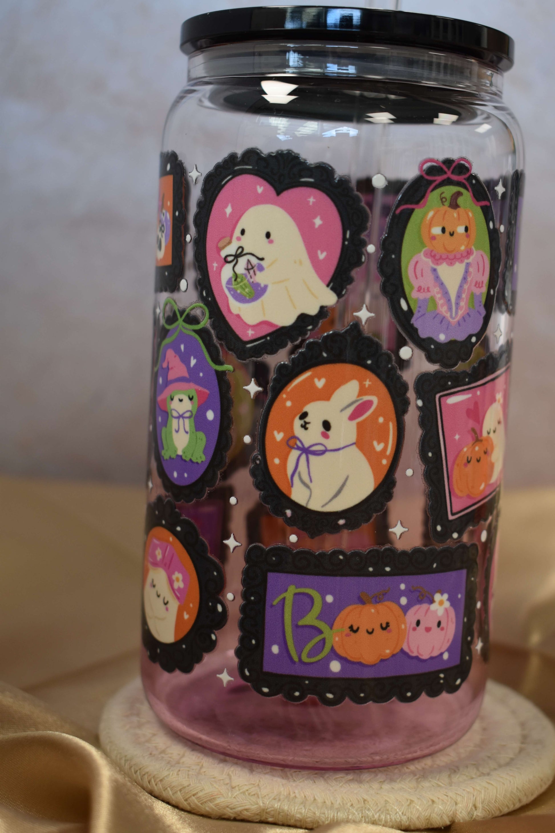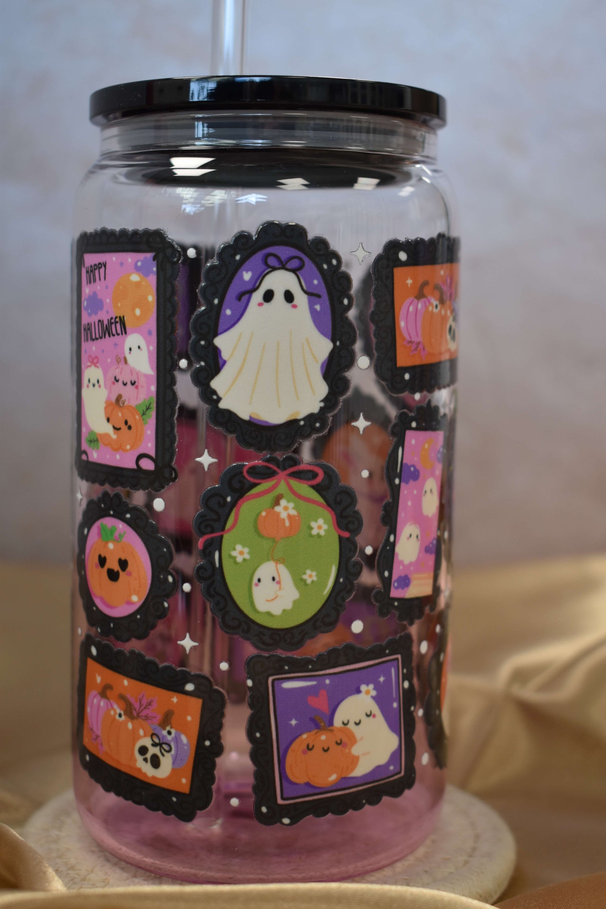 Das handveredelte Trinkglas "Haunted Frames" kombiniert den Charme klassischer Bilderrahmen mit liebevoll illustrierten Halloween-Motiven - von süssen Geistern über Kürbisse bis hin zu festlichen Schleifen. Jedes Motiv wirkt wie ein Mini-Gemälde und kommt auf dem zarten Ombre-Farbverlauf von transparent zu rosa besonders schön zur Geltung.