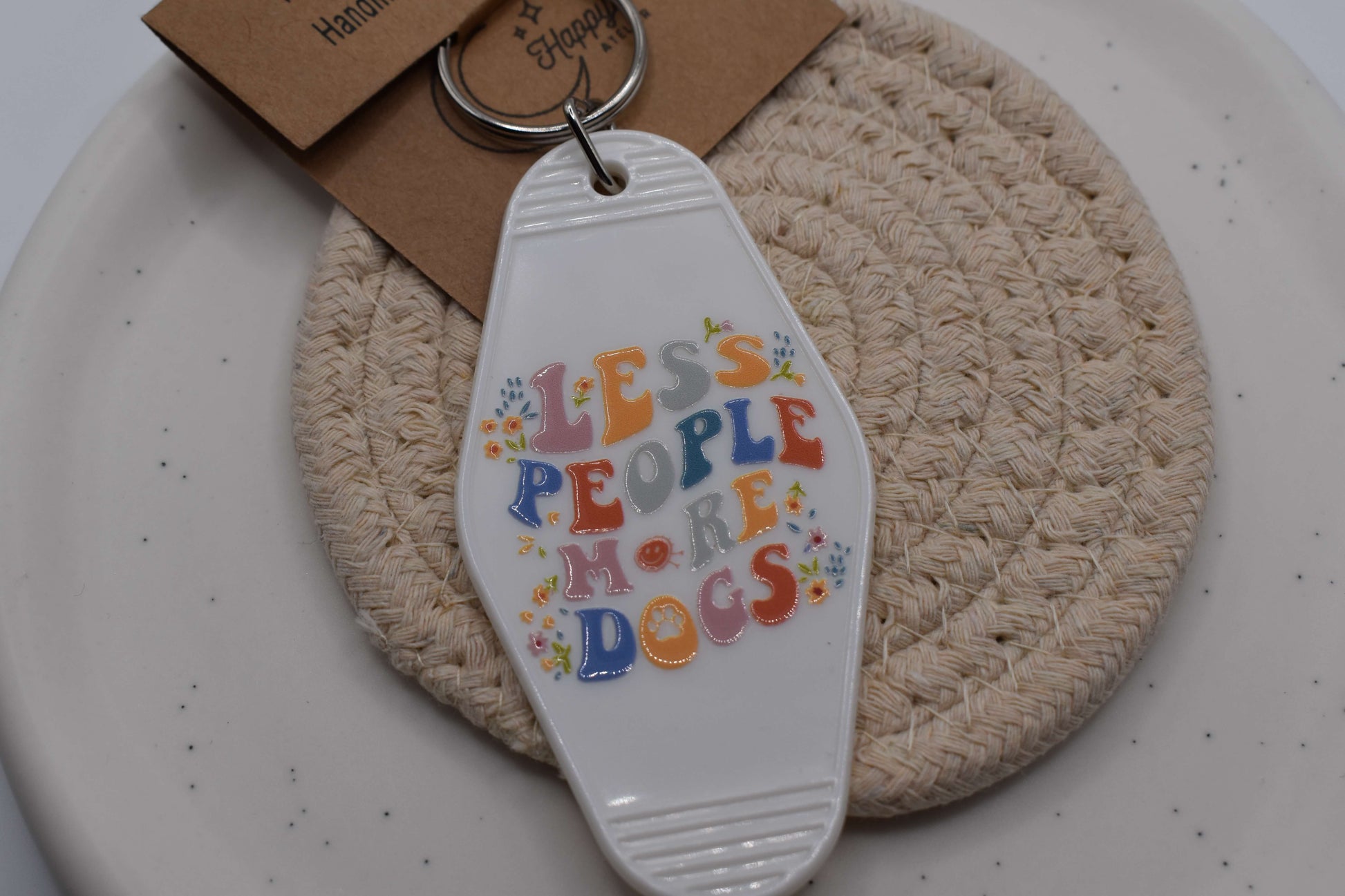 Für alle, die Hunde einfach lieben - dieser Less People More Dogs Schlüsselanhänger ist ein Must-have für jeden Tierfreund! Das bunte Retro-Design bringt gute Laune in deinen Alltag und zeigt deine Tierliebe mit einem Augenzwinkern. Ob am Schlüsselbund, an der Handtasche oder am Rucksack - dieser Anhänger ist das perfekte Statement für alle Dog Lovers.