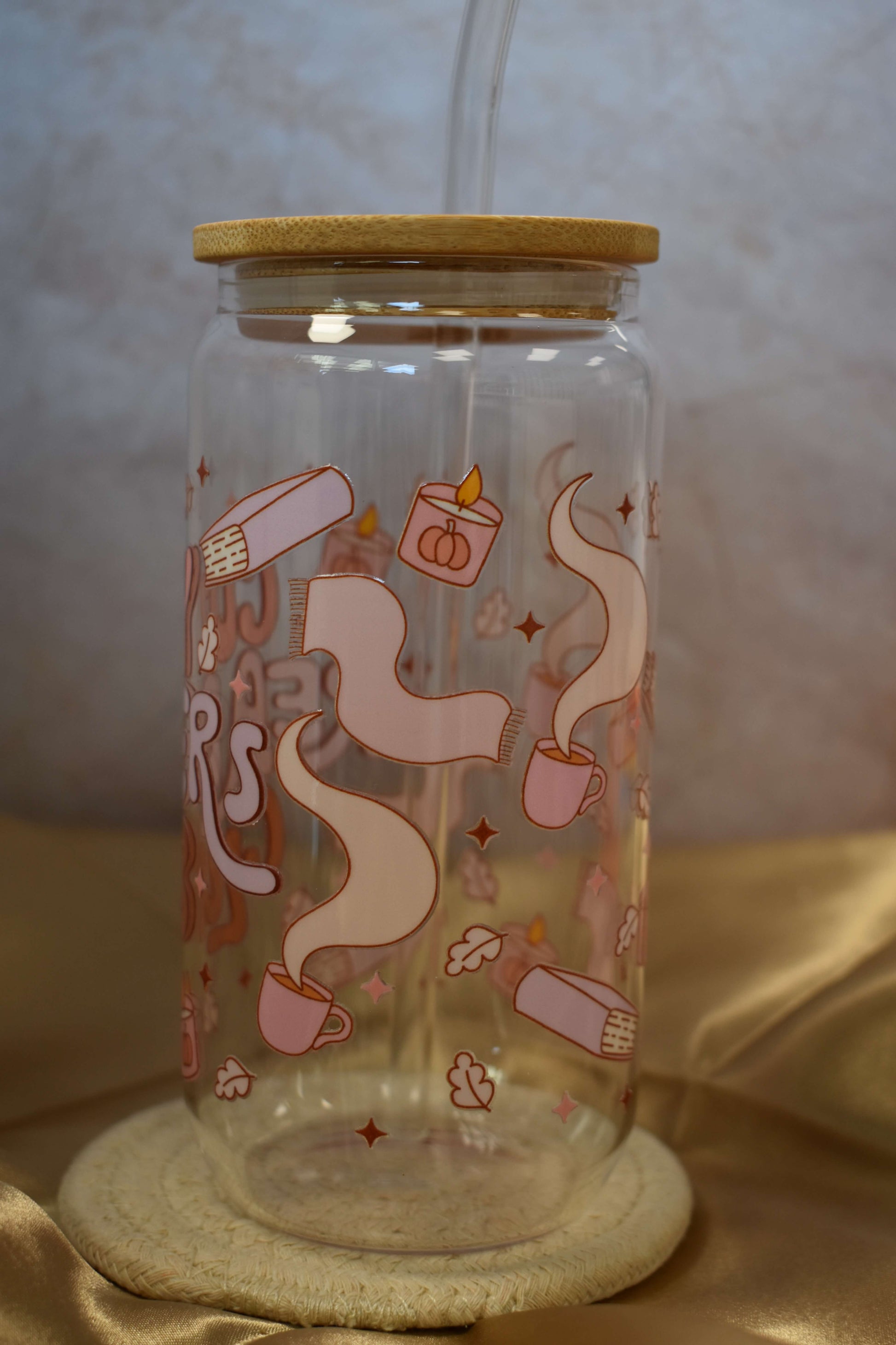 Willkommen im Cozy Readers Club - dem perfekten Begleiter für alle, die Bücher und kuschelige Herbstabende lieben. Dieses liebevoll gestaltete Trinkglas vereint alles, was das Herz von Bücherwürmern höher schlagen lässt: Bücher, Kerzen, fallende Blätter und sanfte Herbstfarben in warmen Rosé- und Brauntönen.
