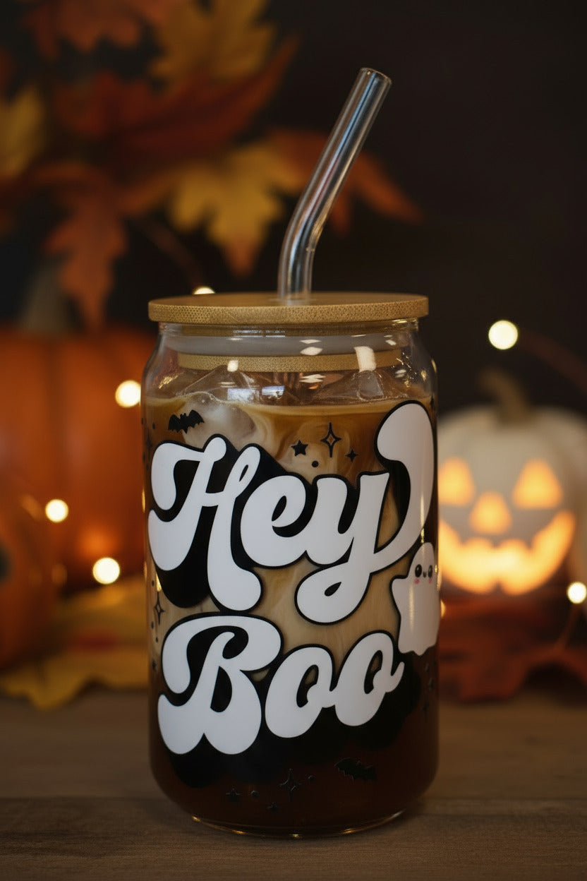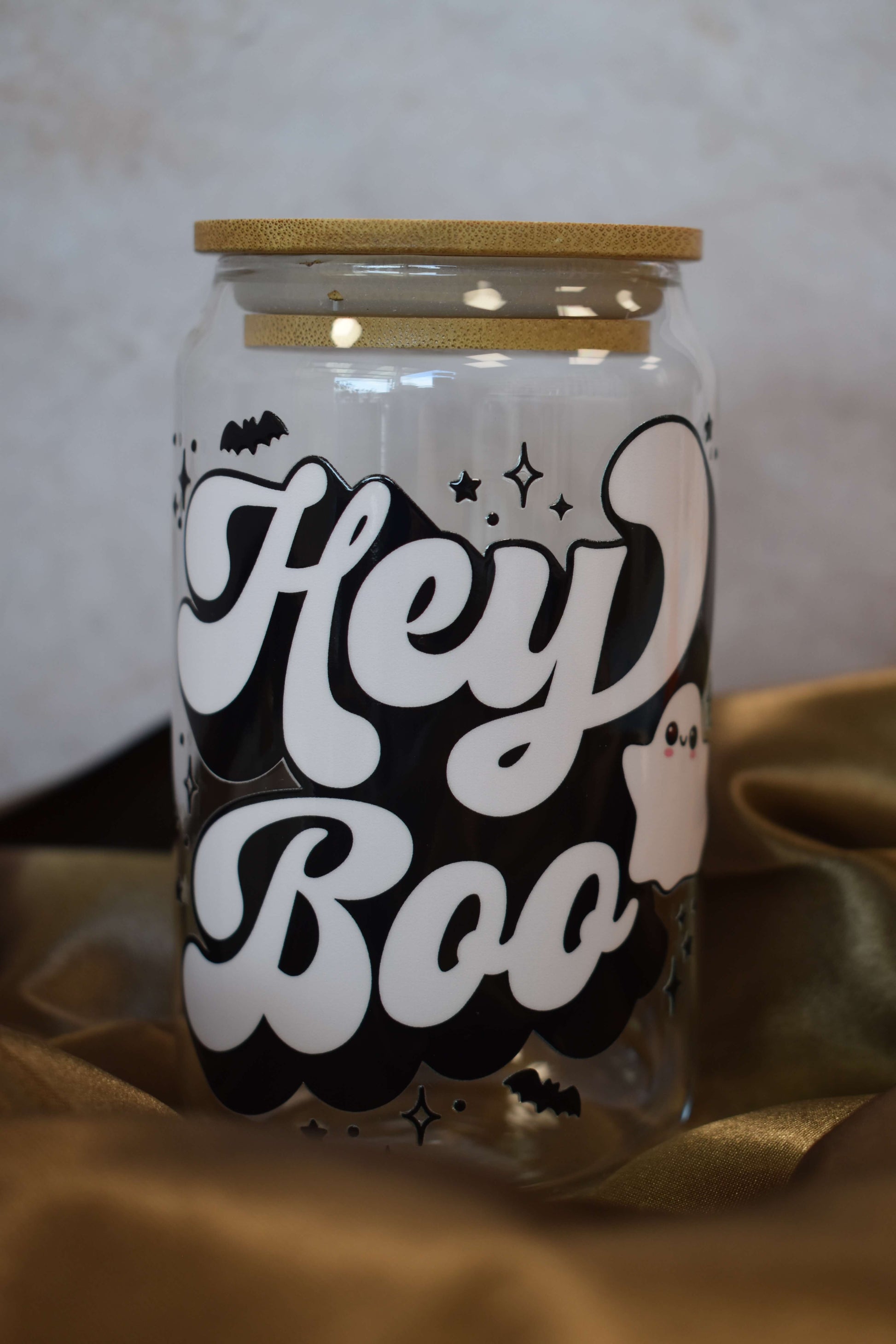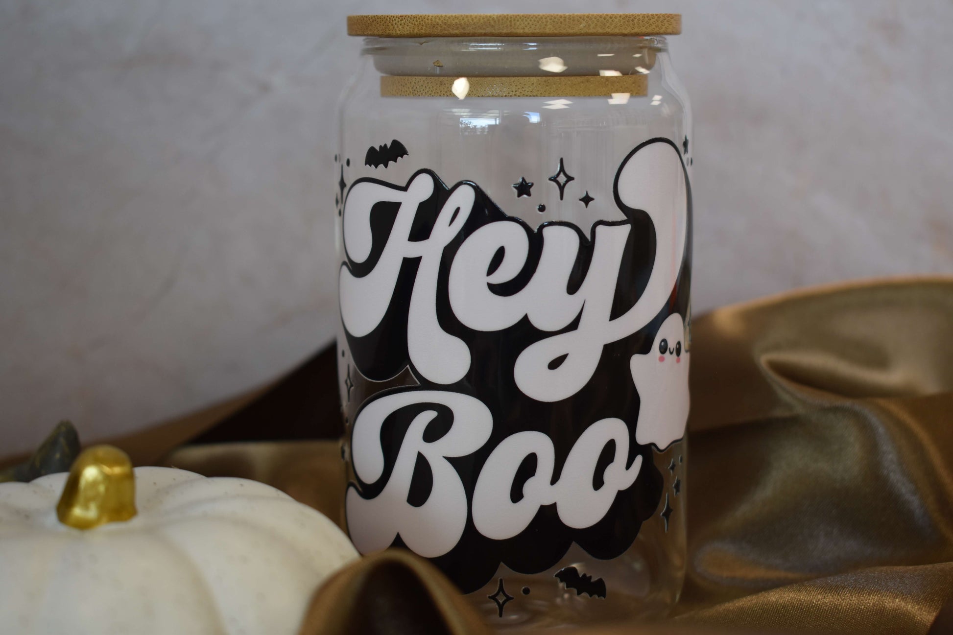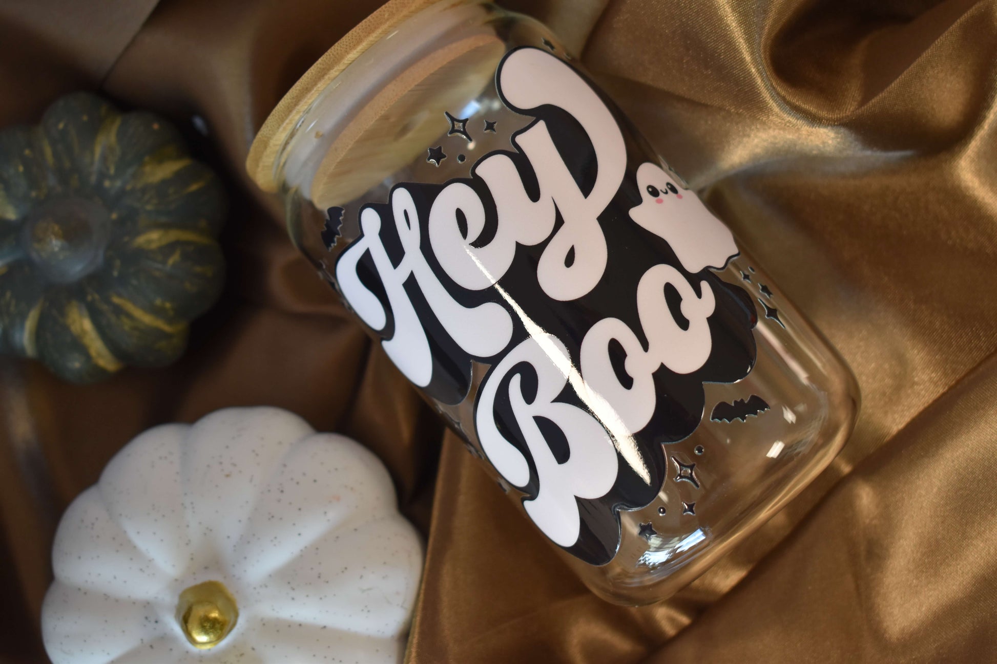 Stylisch, frech & ein bisschen spooky - das handveredelte Trinkglas "Hey Boo" ist der perfekte Begleiter für alle, die Halloween lieben, aber es modern und schlicht mögen. Mit seinem auffälligen Schriftzug "Hey Boo" und dem kleinen süssen Geist wird jedes Getränk zum Statement - perfekt für deine Lieblingsgetränke in der Spooky Season.