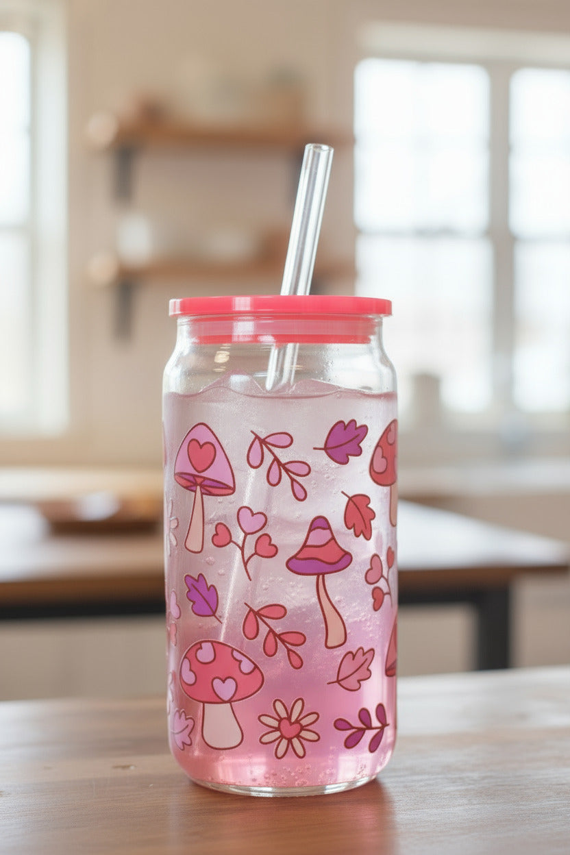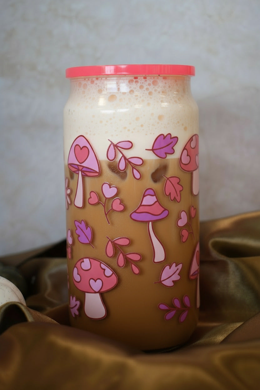 Verspielt, fröhlich & voller Gute-Laune-Vibes - das handveredelte Trinkglas "Pink Mushroom Meadow" bringt Farbe und Leichtigkeit in deinen Alltag. Das liebevolle Design aus rosa- und lilafarbenen Pilzen, Blättern und Blüten zaubert dir bei jedem Schluck ein Lächeln aufs Gesicht - perfekt für Frühlingsgefühle, Herbstmomente oder einfach zwischendurch.