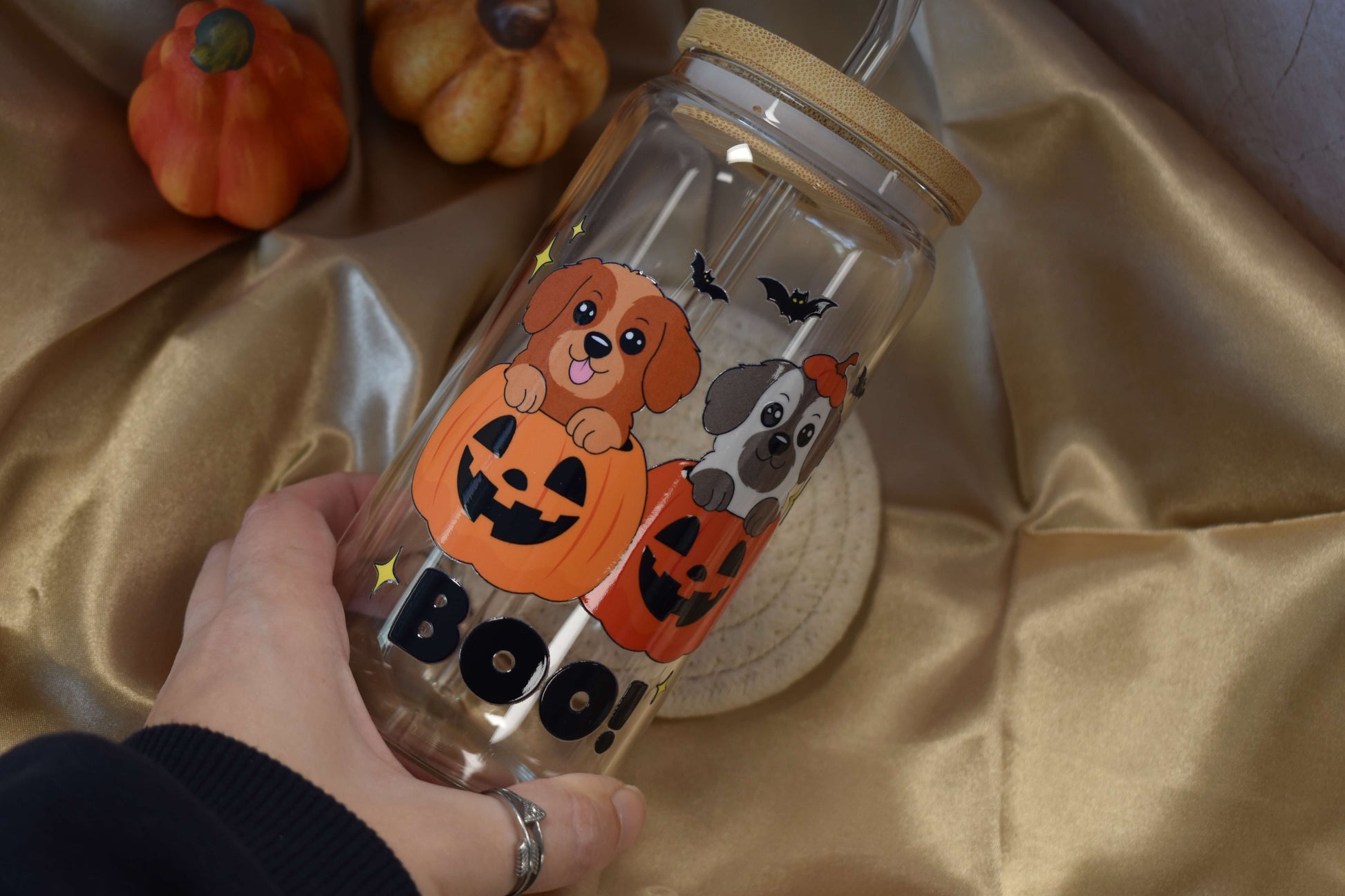 Süss, verspielt und perfekt für Halloween! Das handveredelte Trinkglas "Puppy Boo" zeigt zwei zuckersüsse Hunde, die neugierig aus Kürbissen schauen - begleitet von kleinen Fledermäusen und einem fröhlichen "BOO!"