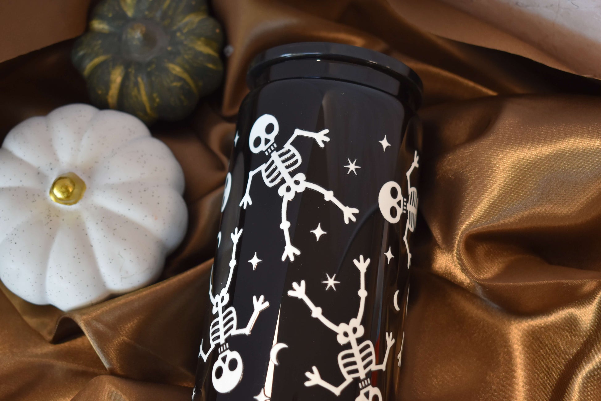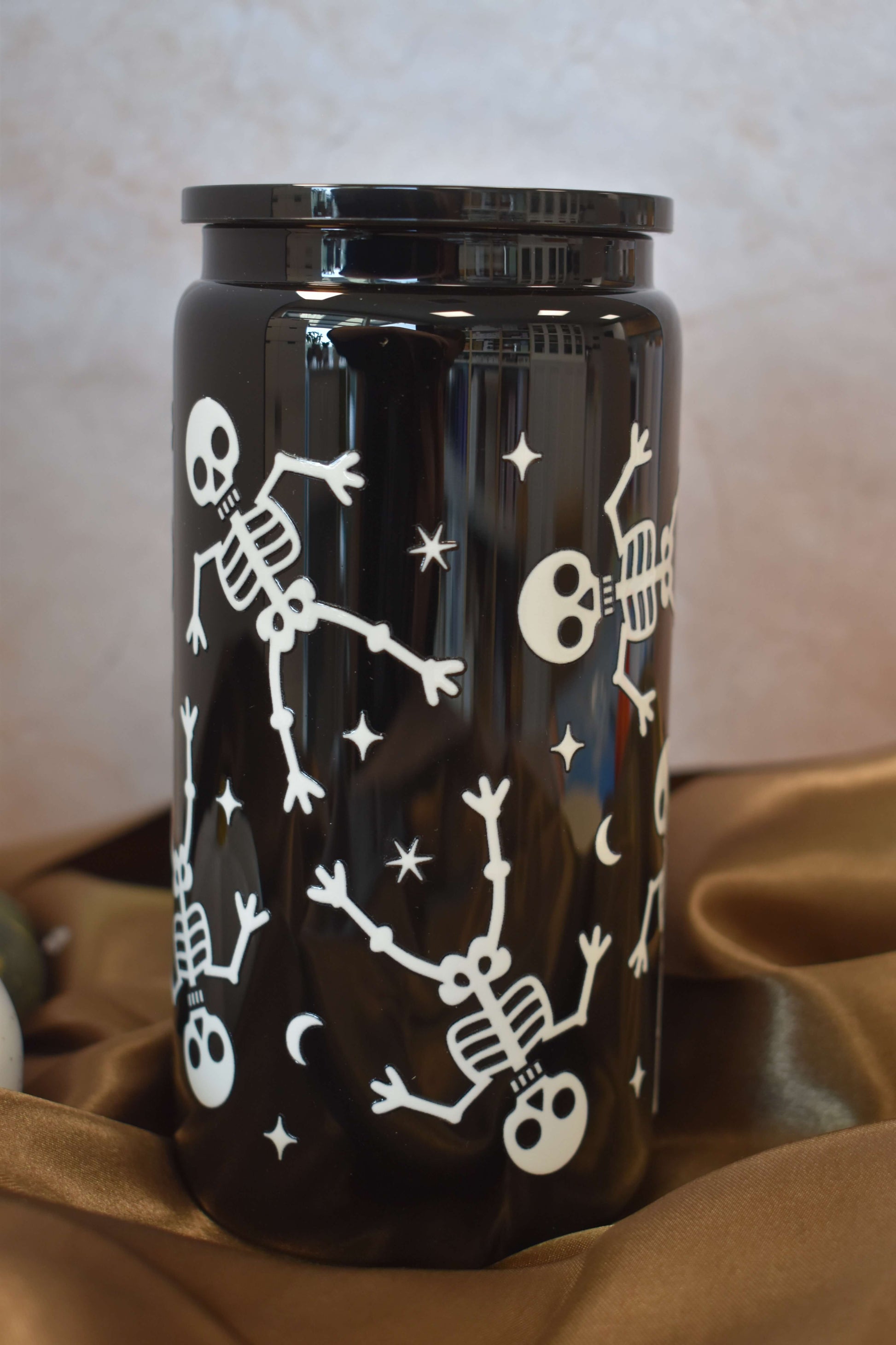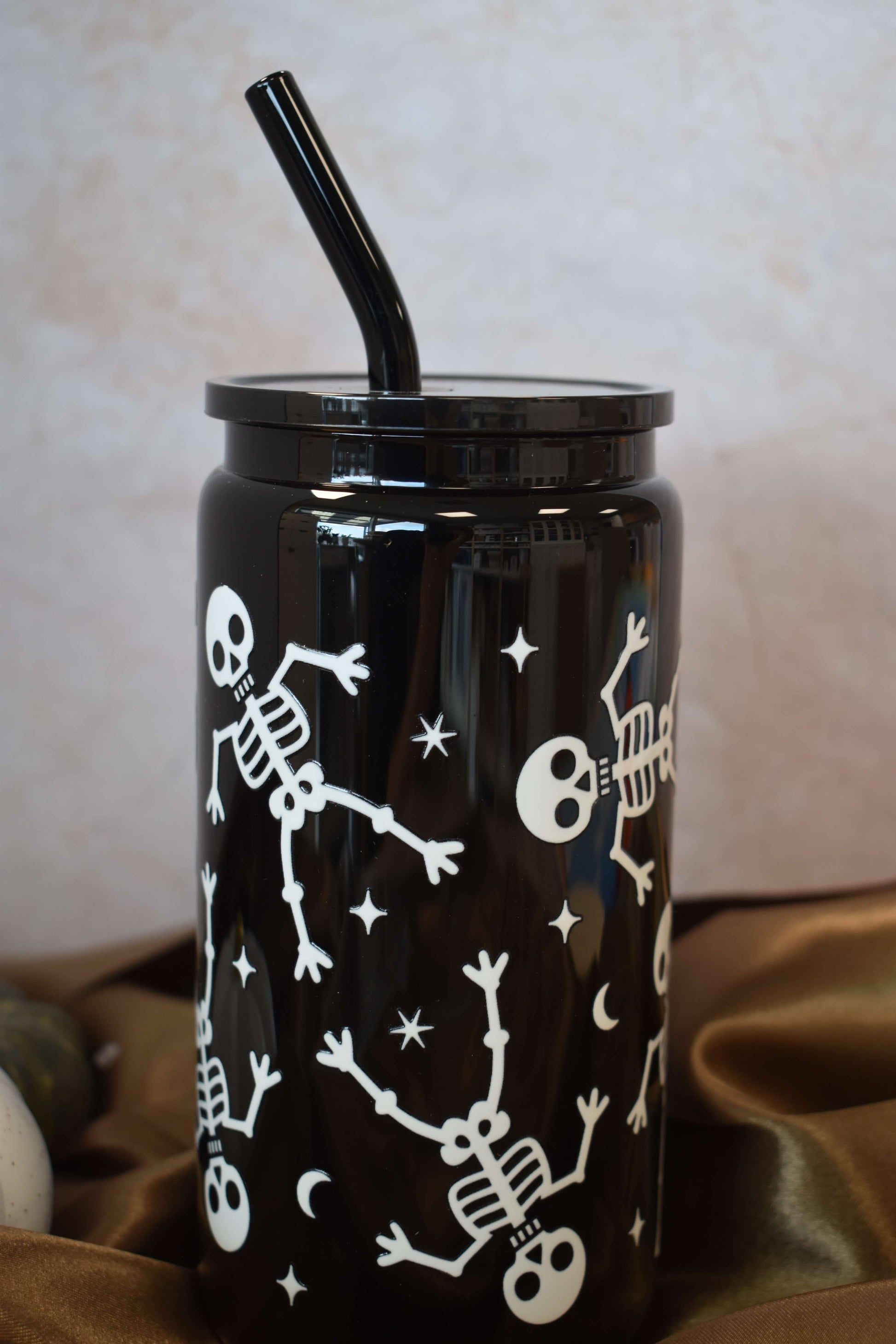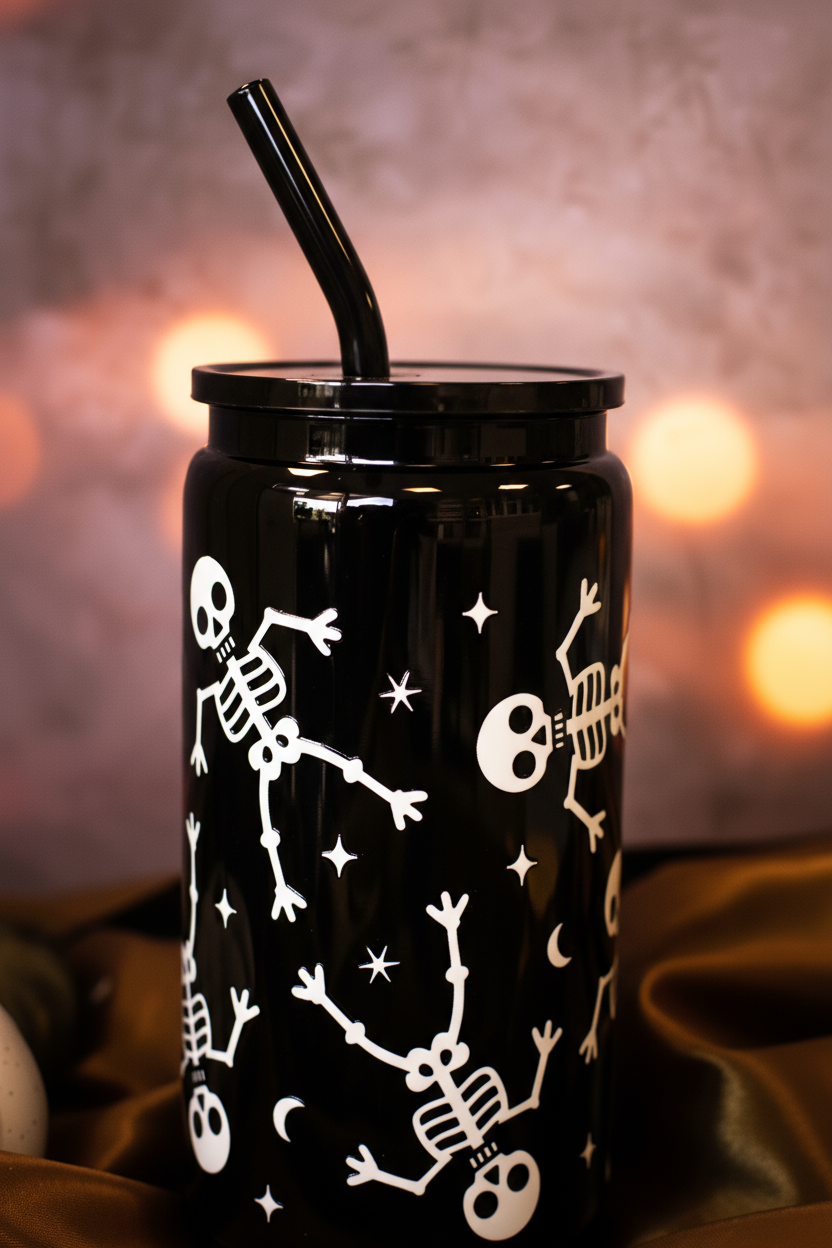 Spooky, stylish & voller Halloween-Vibes - das handveredelte Trinkglas "Dance of Bones" ist ein echter Hingucker für alle, die das Unheimliche mit Stil lieben. Die weissen, tanzenden Skelette auf tiefschwarzem Hintergrund sorgen für den perfekten Mix aus gruselig & cool - ideal für deine Halloween-Drinks oder einfach, um ein Statement zu setzen.