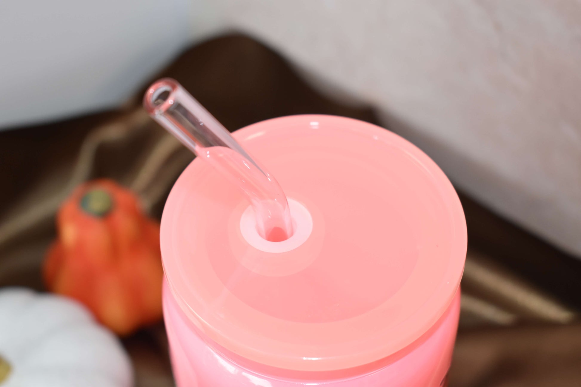 Dieses Glas kann mit rosa Glasstrohhalm & Deckel oder ohne Zubehör gekauft werden. In unserem Shop findest du zudem weiteres passendes Zubehör, wie z.B. Acryldeckel, farbige Strohhalme oder Untersetzer, um dein Glas individuell zu ergänzen.