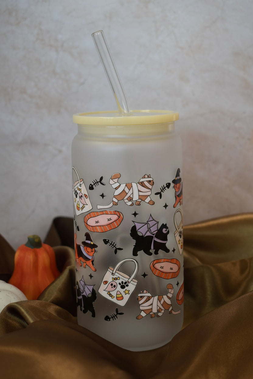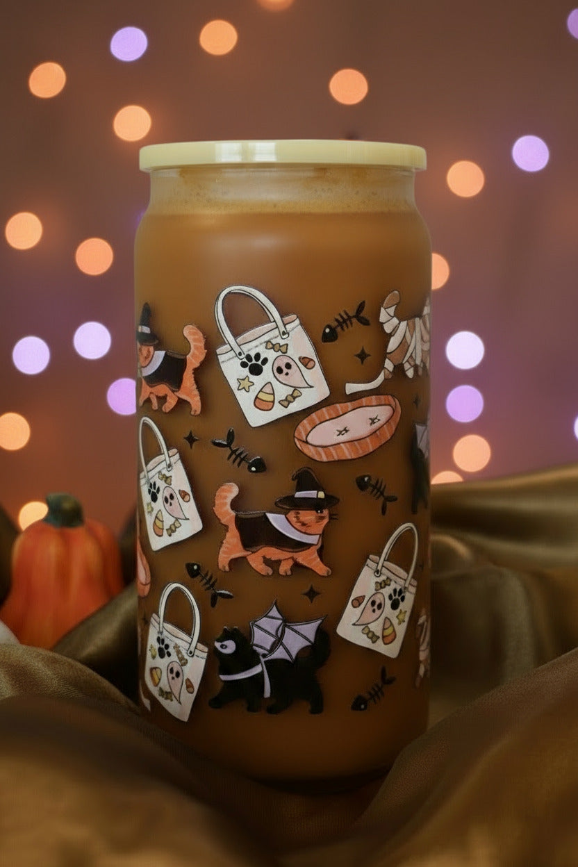 Das charmante Design zeigt kleine Hexenkatzen mit Hüten, Katzen im Fledermauskostüm und viele kleine Leckereien - perfekt für alle, die Halloween lieben, aber lieber schnurren statt spuken.