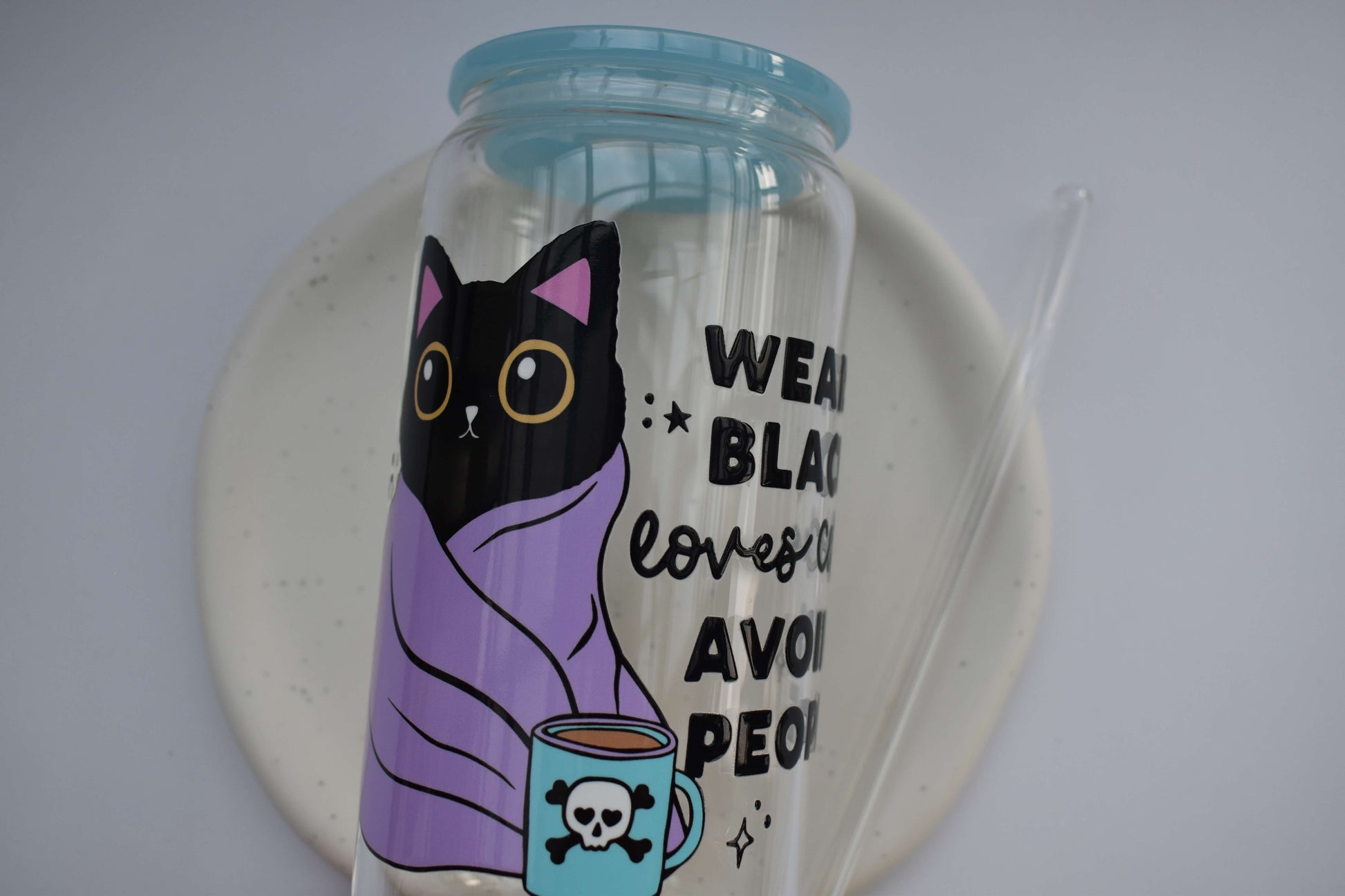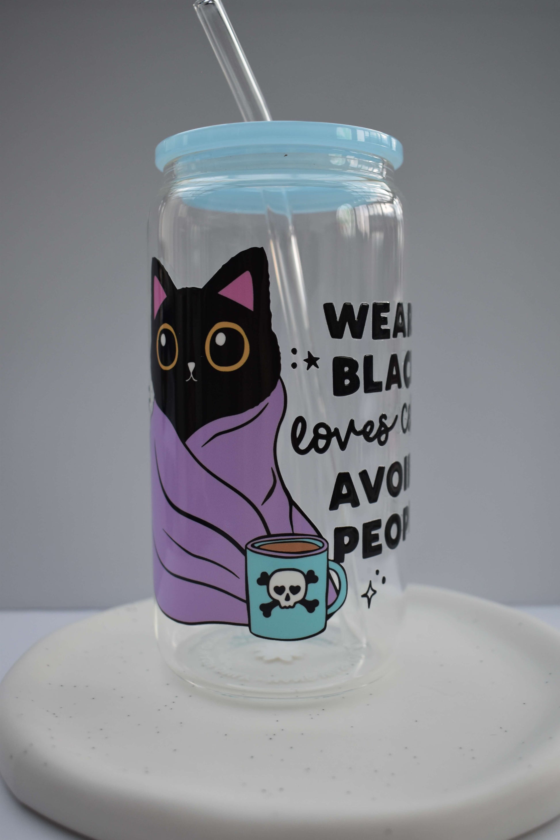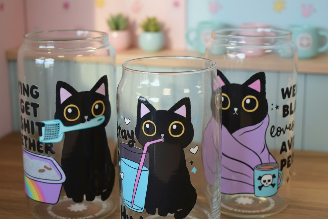 Mit ihren kräftigen Farben, niedlichen Katzenmotiven und einem Hauch Selbstironie sind diese Gläser perfekt für alle, die ihren Iced Coffee genauso schwarz mögen wie ihren Humor.