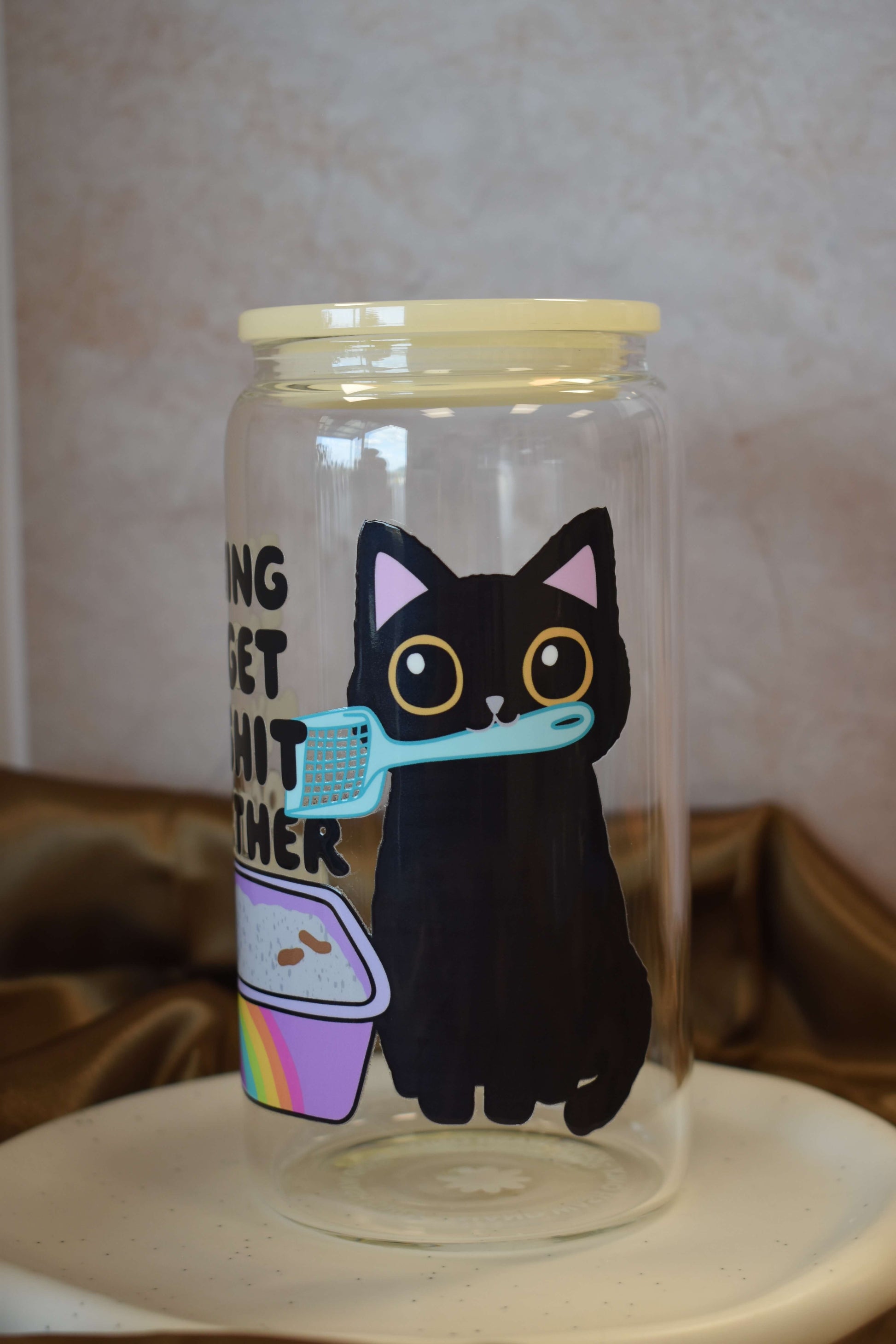 - Handwäsche empfohlen: Um die Motive zu schützen, spüle das Glas am besten von Hand mit einem weichen Schwamm und mildem Spülmittel (nicht in die Spülmaschine, die Folie kann dort beschädigt werden).