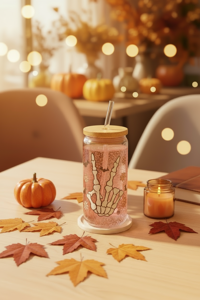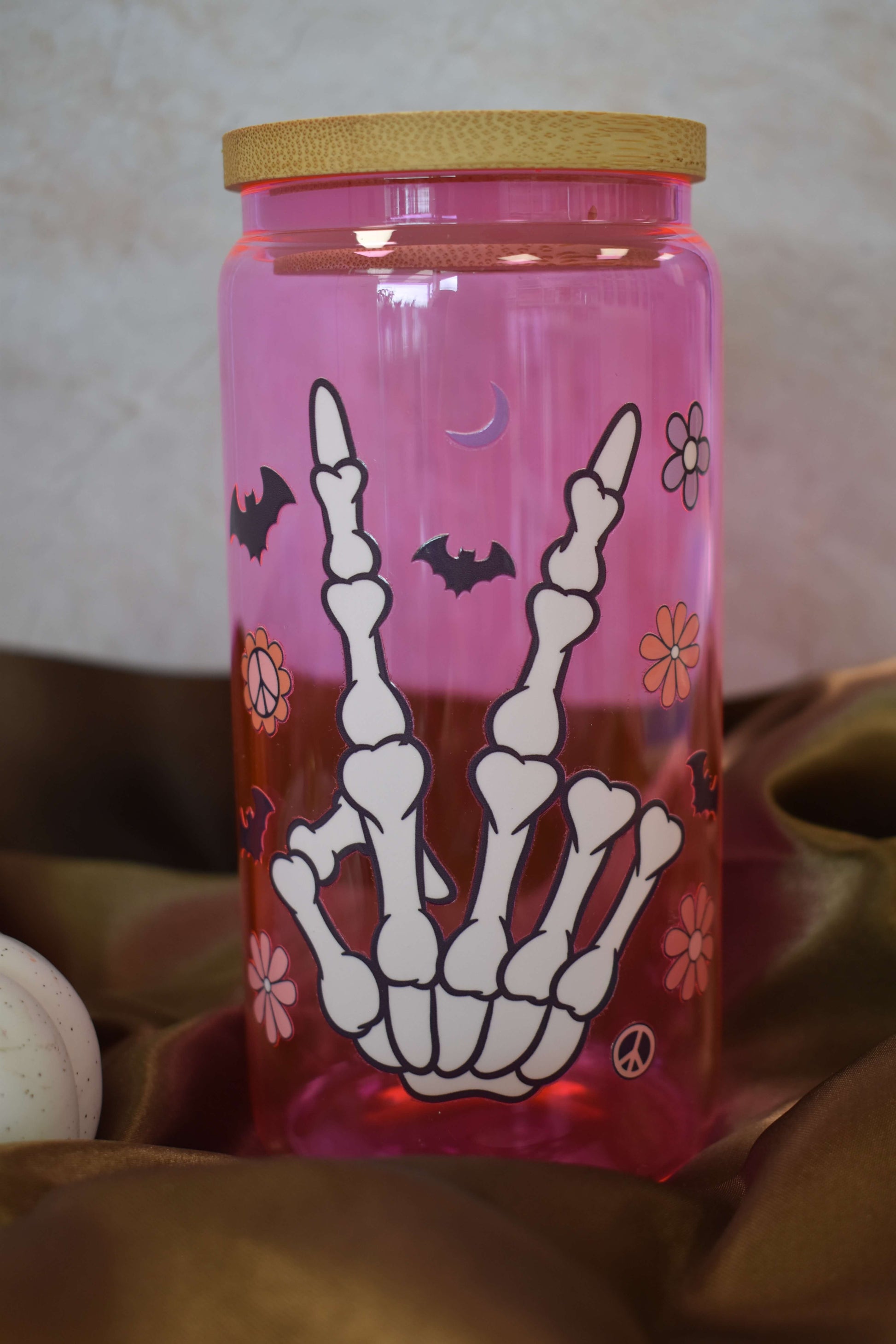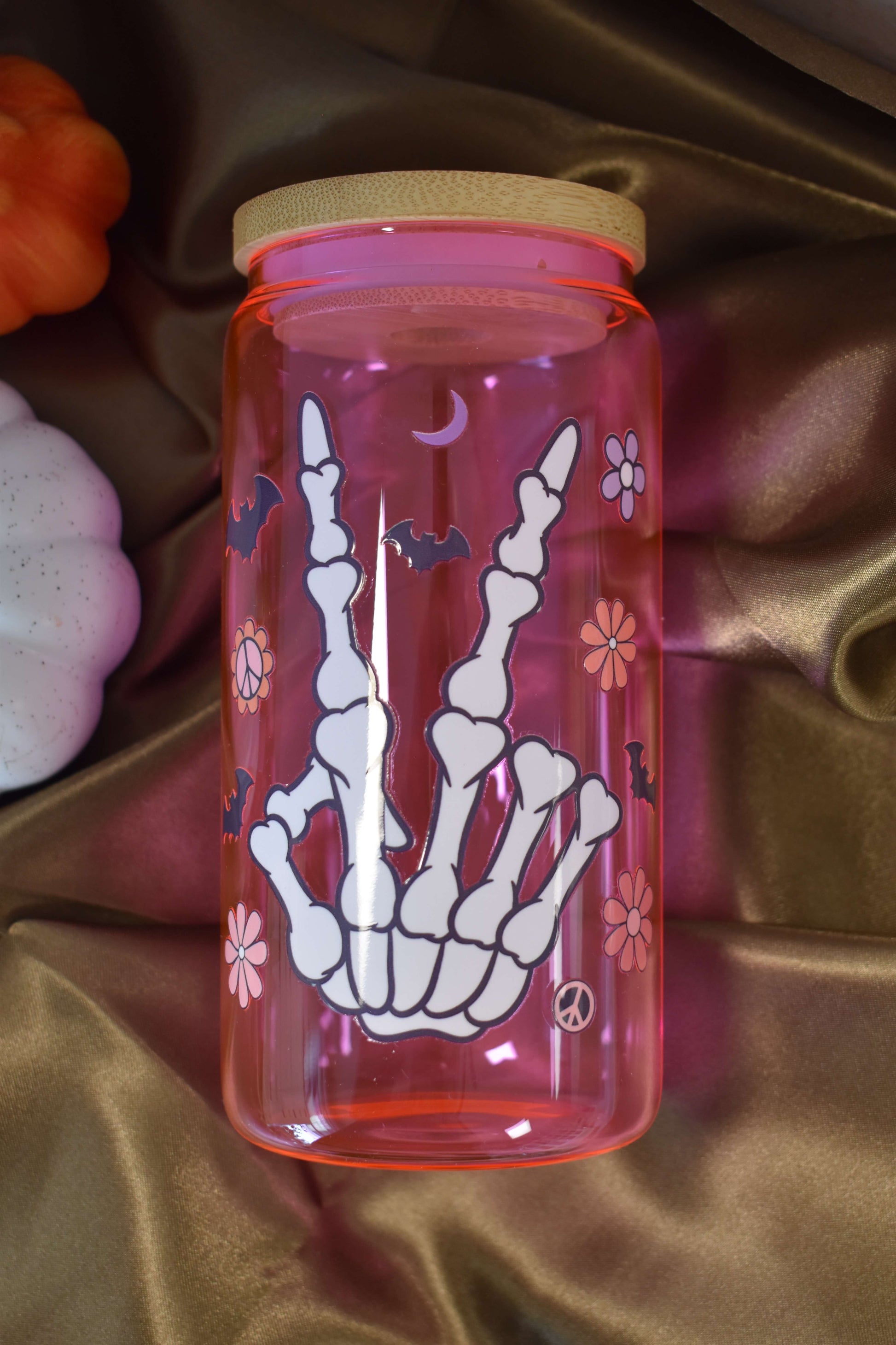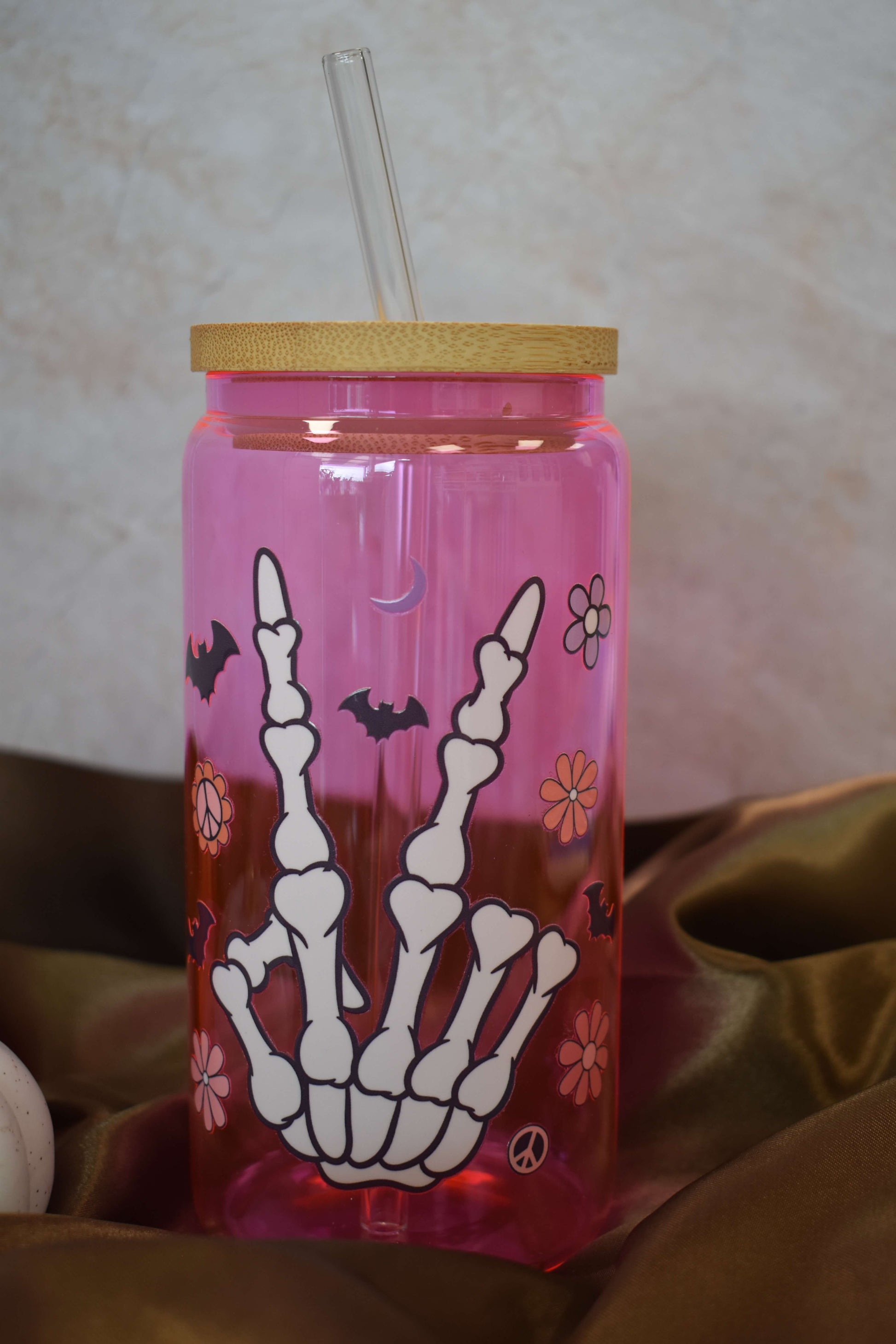 Frech, stylisch & ein bisschen spooky - das handveredelte Trinkglas "Spooky Peace" ist das perfekte Statement für alle, die Halloween lieben, aber es gerne farbenfroh mögen! Das leuchtende Pink kombiniert mit weissen Skelettfingern, Fledermäusen und Retro-Blumen macht dieses Glas zu einem echten Hingucker - sweet & spooky in perfekter Balance.
