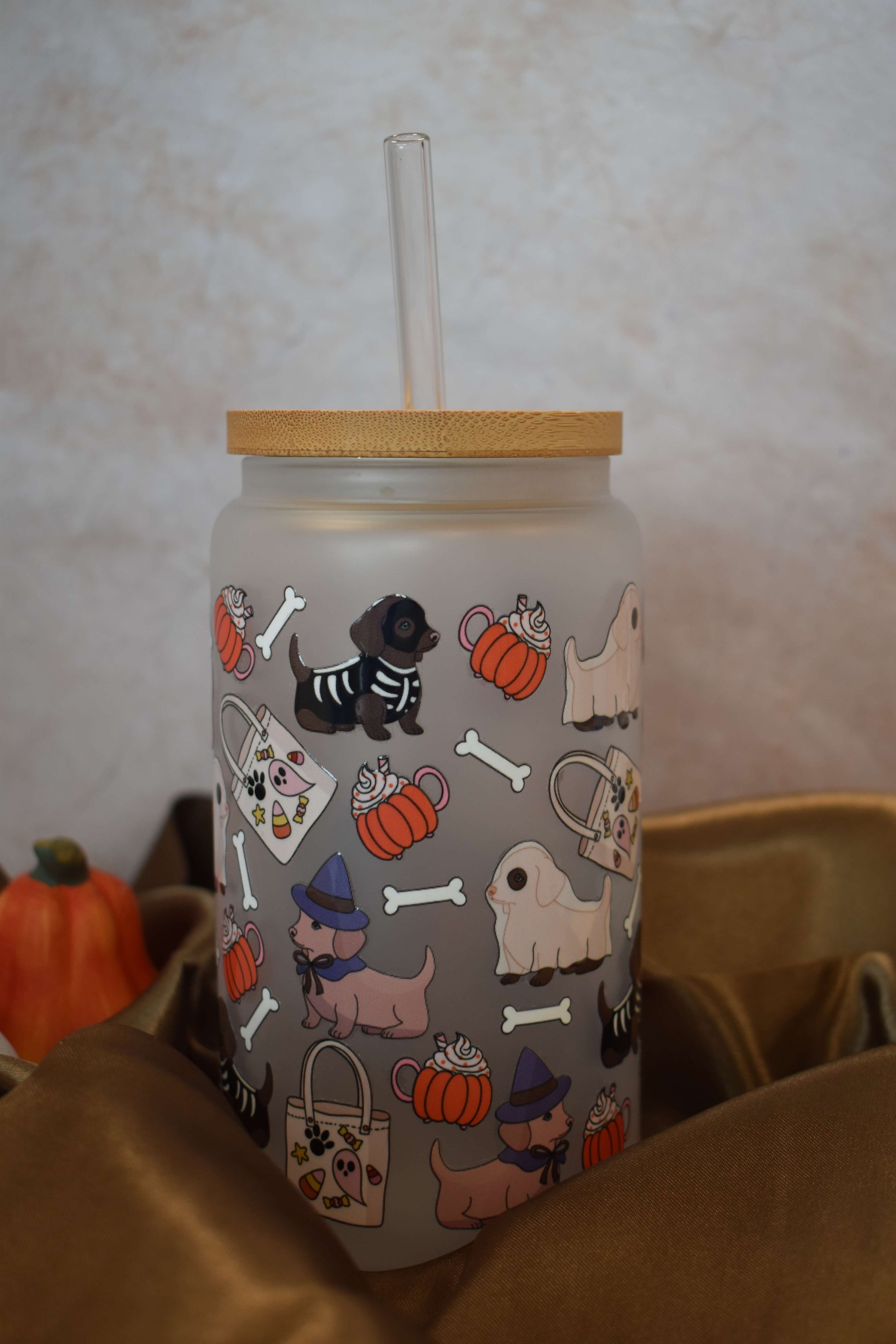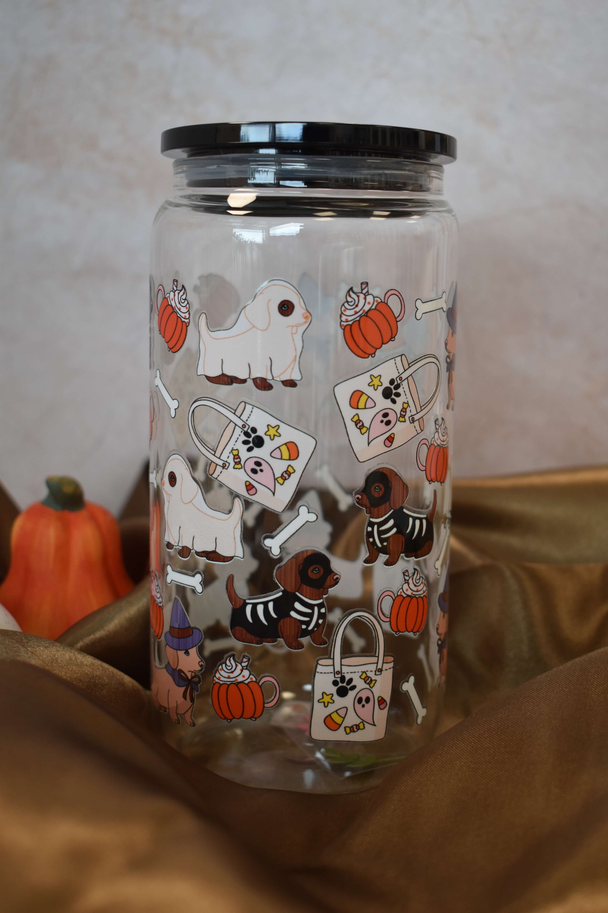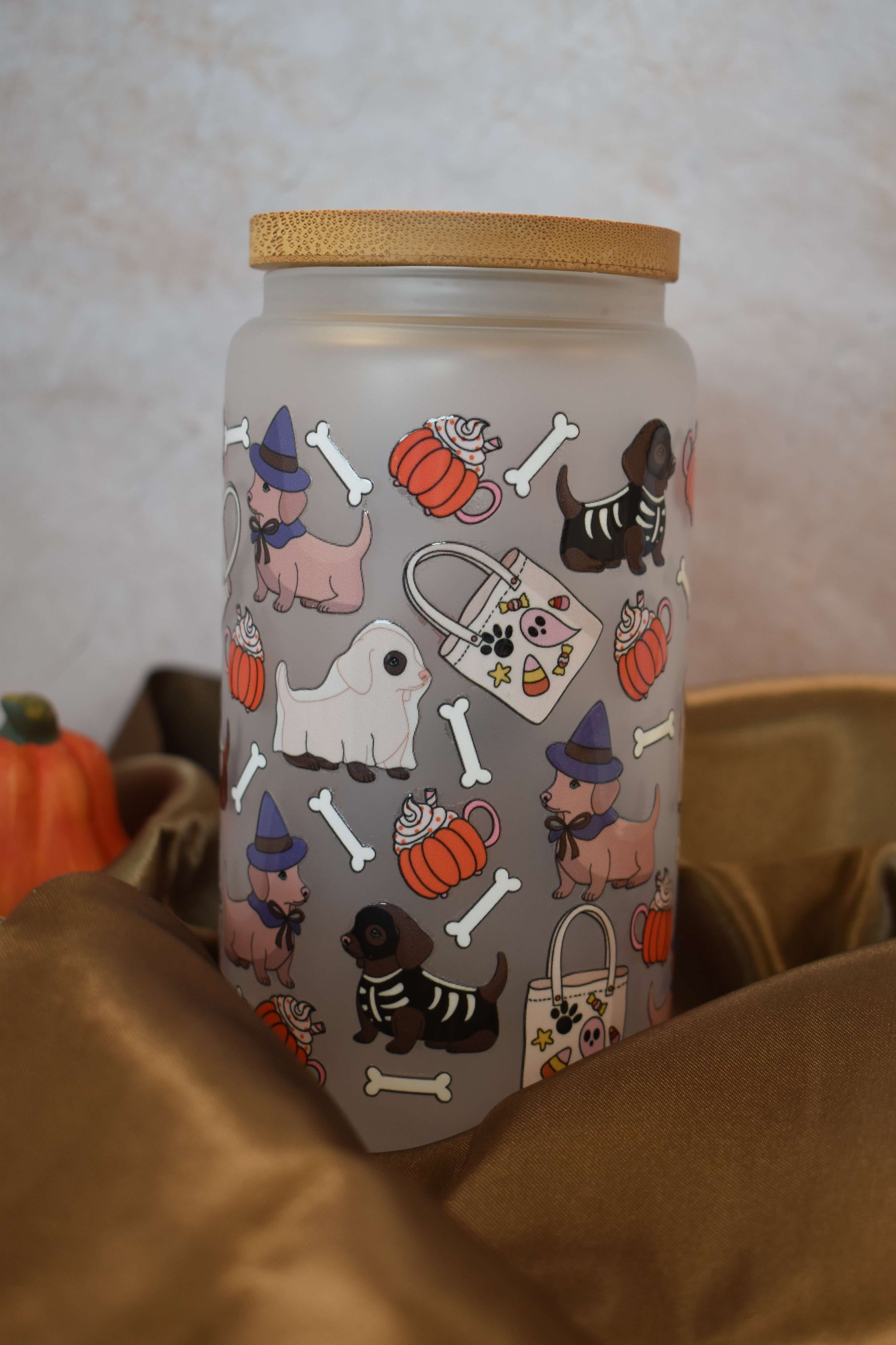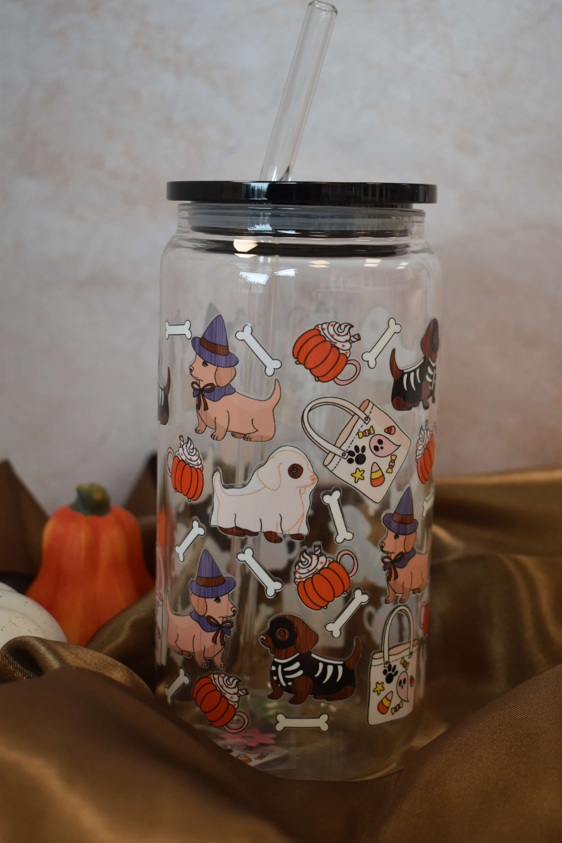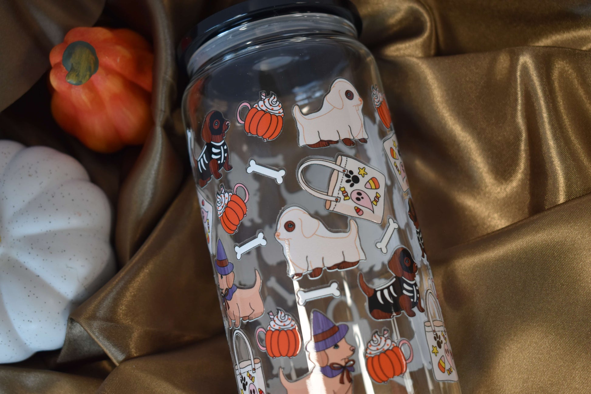 Tierisch süss und einfach unwiderstehlich - das handveredelte Trinkglas "Spooky Sausages" bringt verspielte Herbststimmung direkt zu dir nach Hause. Das liebevolle Design zeigt kleine Dackel im Halloween-Look - mal als Geist, Hexe oder Skelett - zwischen Kürbissen, Knochen & Bonbons. Perfekt für alle Hundeliebhaber:innen!