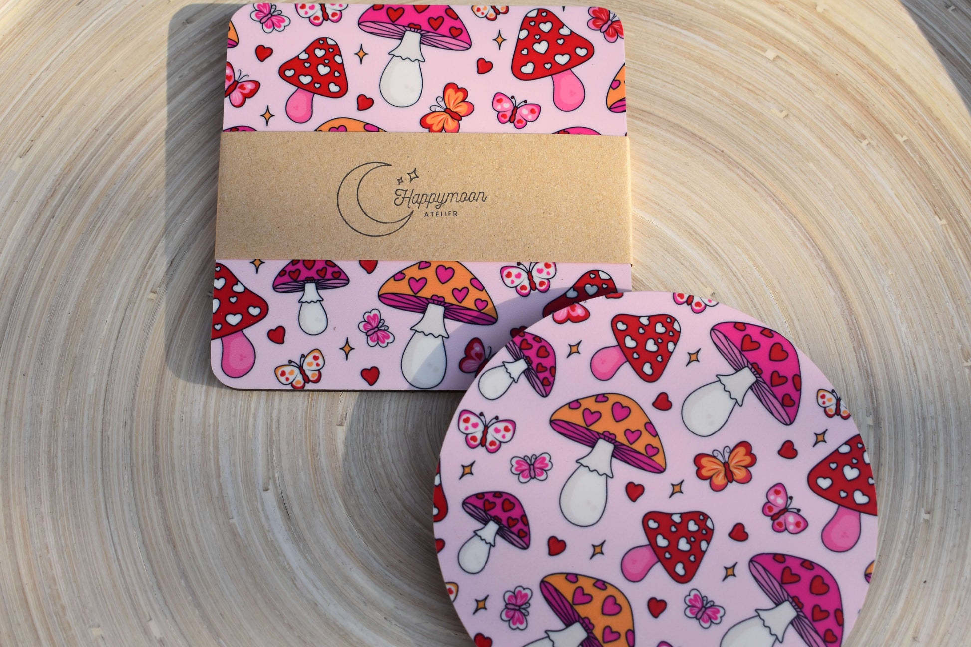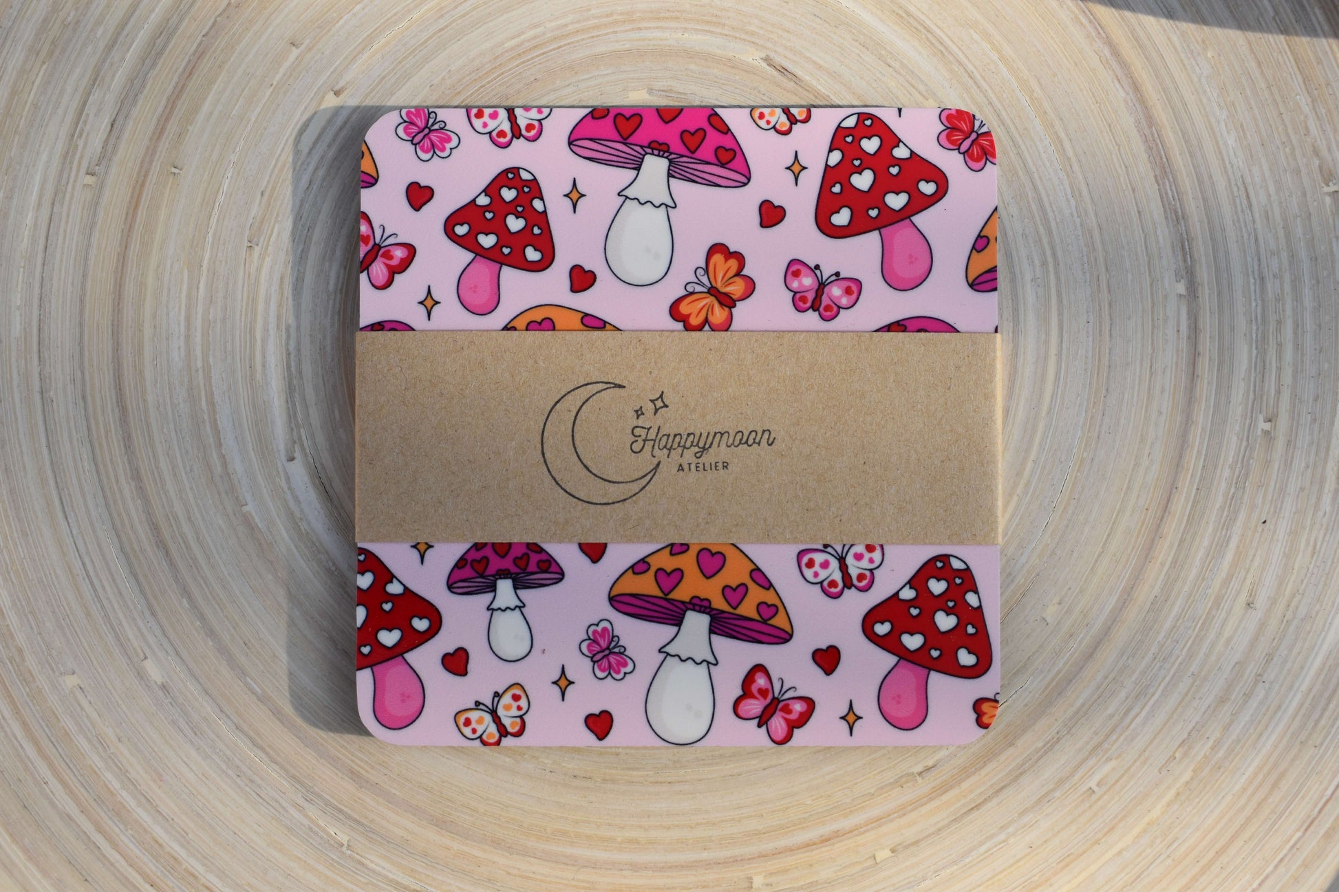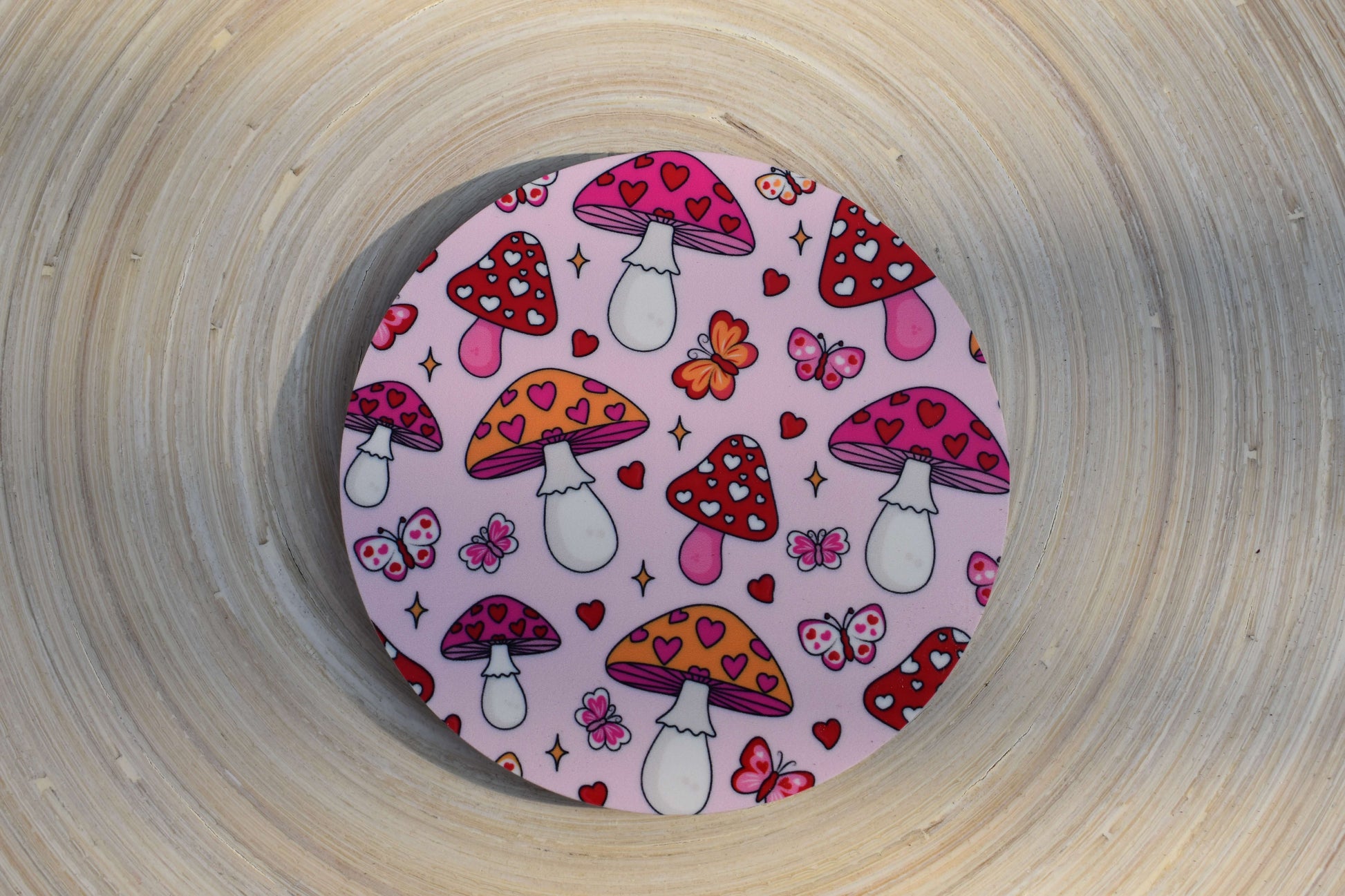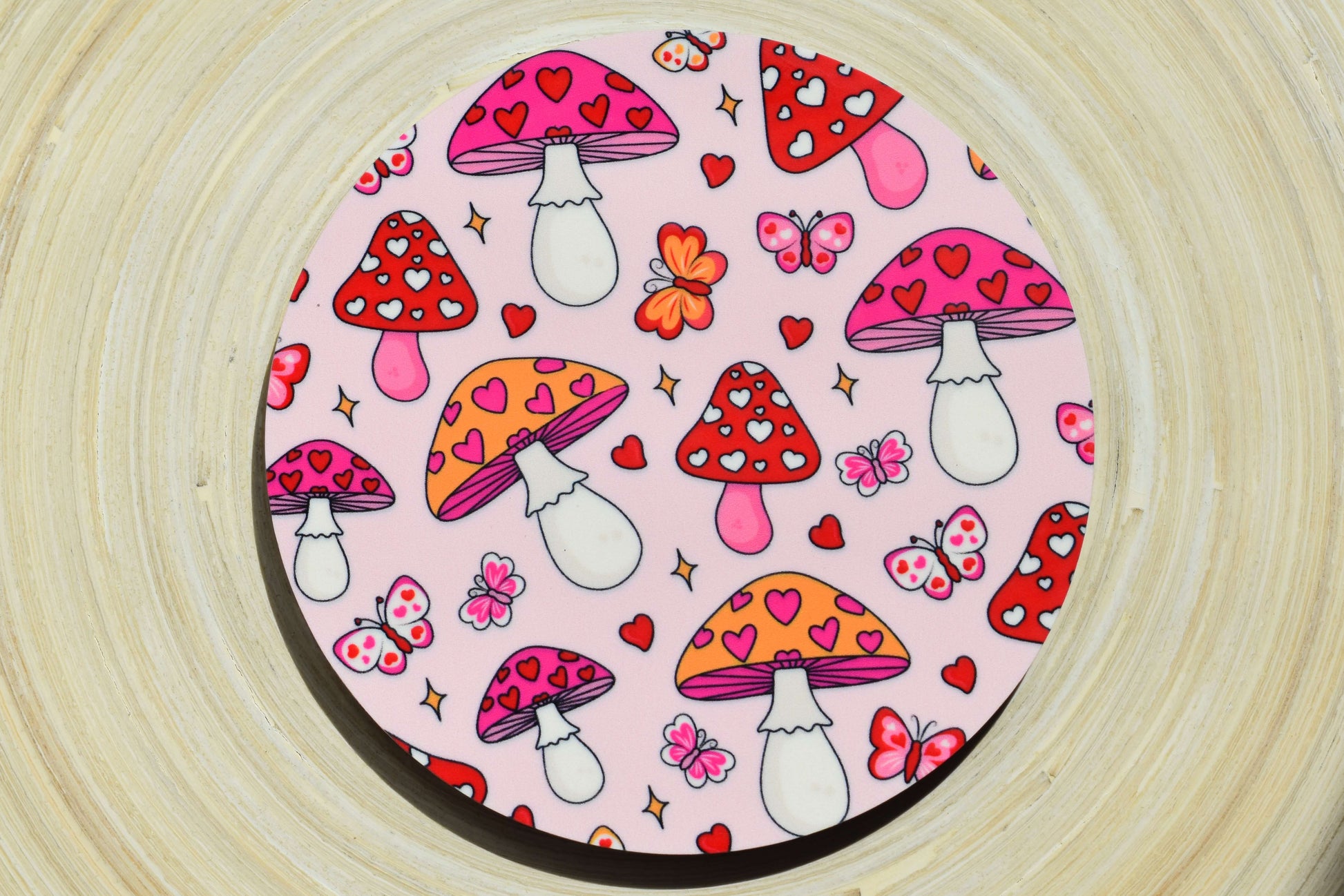 Ein Hauch von Liebe und Natur für deinen Tisch - mit diesem handgefertigtem Untersetzer aus MDF-Holz. Das fröhliche Design mit kleinen Pilzen, Herzen und Schmetterlingen versprüht pure Lebensfreude und bringt eine Portion Glück und Romantik in deinen Alltag.