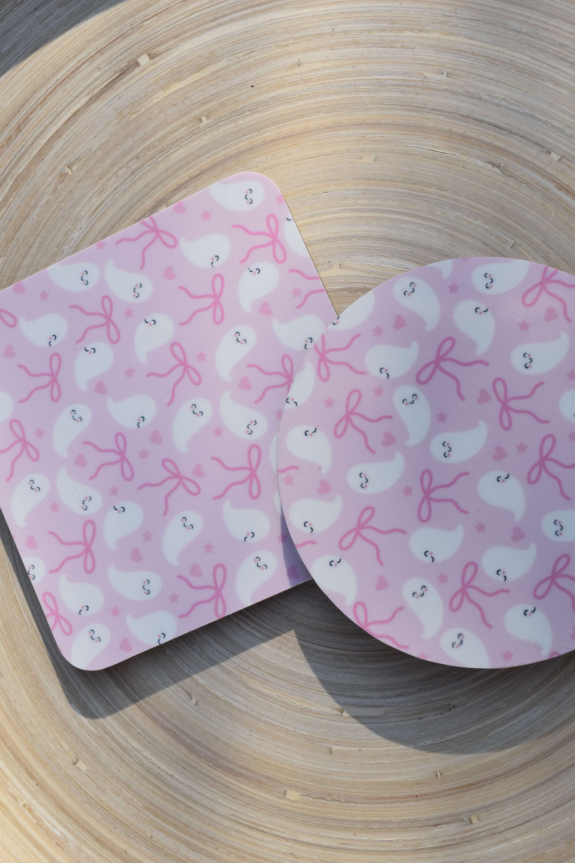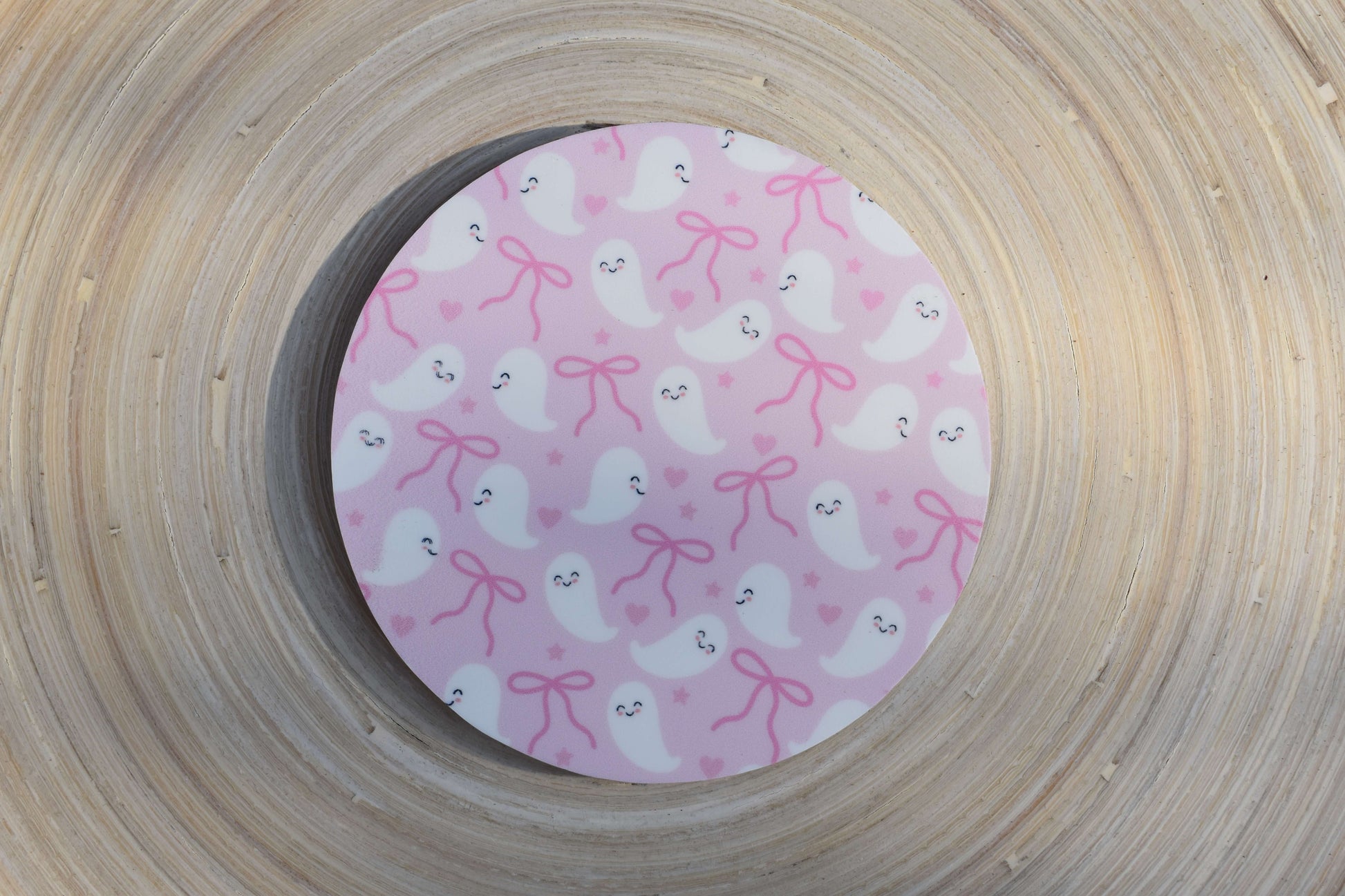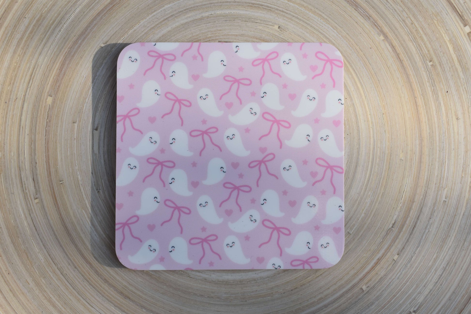 Bringe Gemütlichkeit in deinen Alltag mit diesem handgefertigten Untersetzer aus MDF-Holz.Mit seinen niedlichen kleinen Geistern, rosa Schleifen & pastelligen Tönen ist er das perfekte Accessoire für alle, die Halloween lieben - aber lieber in cute als creepy.