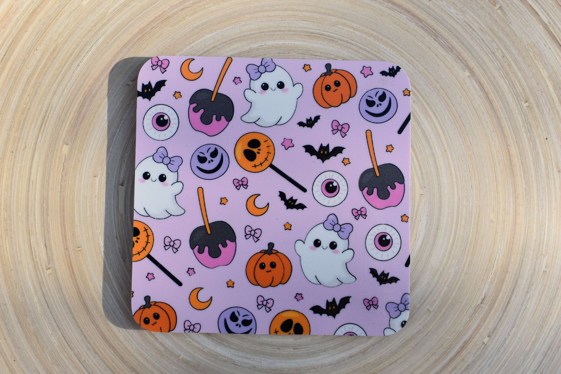Versüsse dir den Herbst mit diesem handgefertigten Untersetzer aus MDF-Holz. Ein verspieltes Halloween-Design in zarten Pastellfarben mit kleinen Geistern, Kürbissen, Fledermäusen und Bonbons - perfekt für alle, die spooky lieben, aber süss statt gruselig feiern.